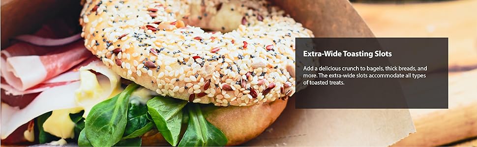 • Extra-Wide Toasting Slots - Add a delicious crunch to bagels, thick breads, and more. The extra-wide slots accommodate all types of toasted treats