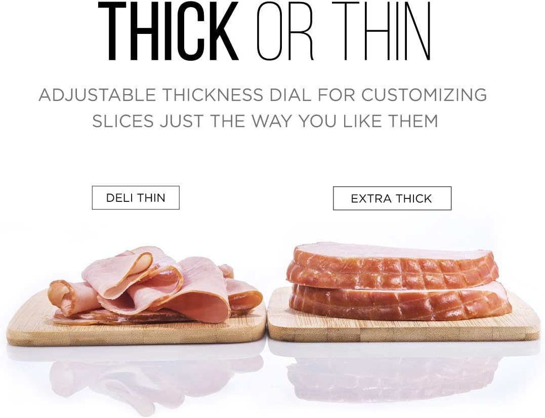 - SLICE YOUR FAVORITES: Use your food cutter to easily slice deli style ham, turkey, roast beef, dried meat, cheese, bread, fruit, and vegetables right in your own kitchen. The food slicer is equipped with an adjustable thickness dial for customizing slices just the way you like them.