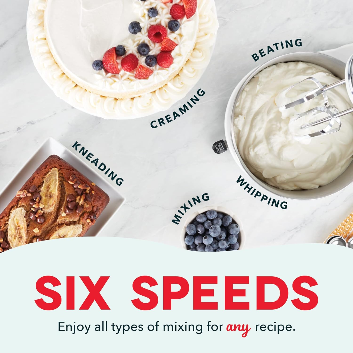 - 6 SPEED: This portable, compact mixer packs a punch with a 250watt motor and 6 different speed options ranging low to high to whip, beat or knead with even, uniform results