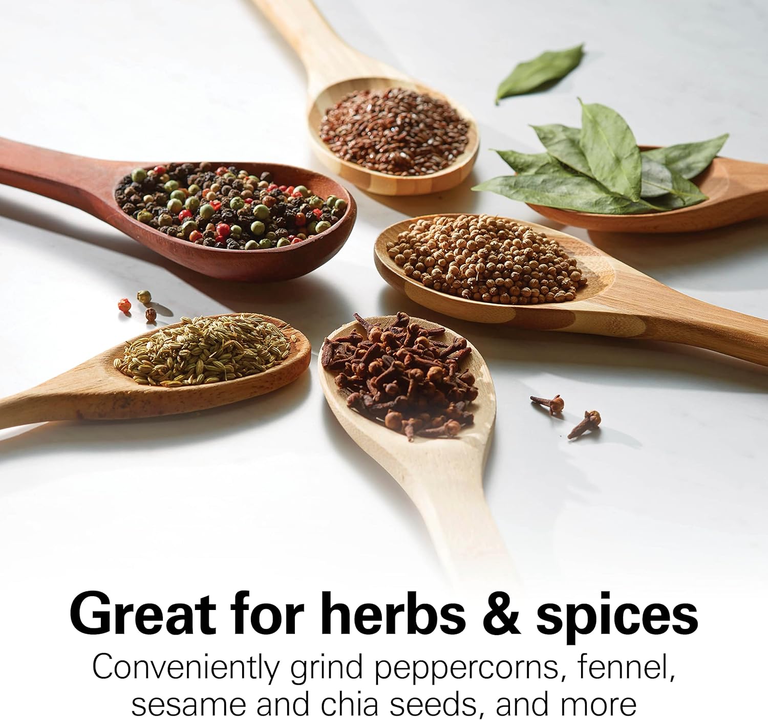 - DURABLE STAINLESS STEEL BLADES: With the durable stainless steel blades, this grinder makes easy work of grinding everything from coffee beans to herbs and spices.