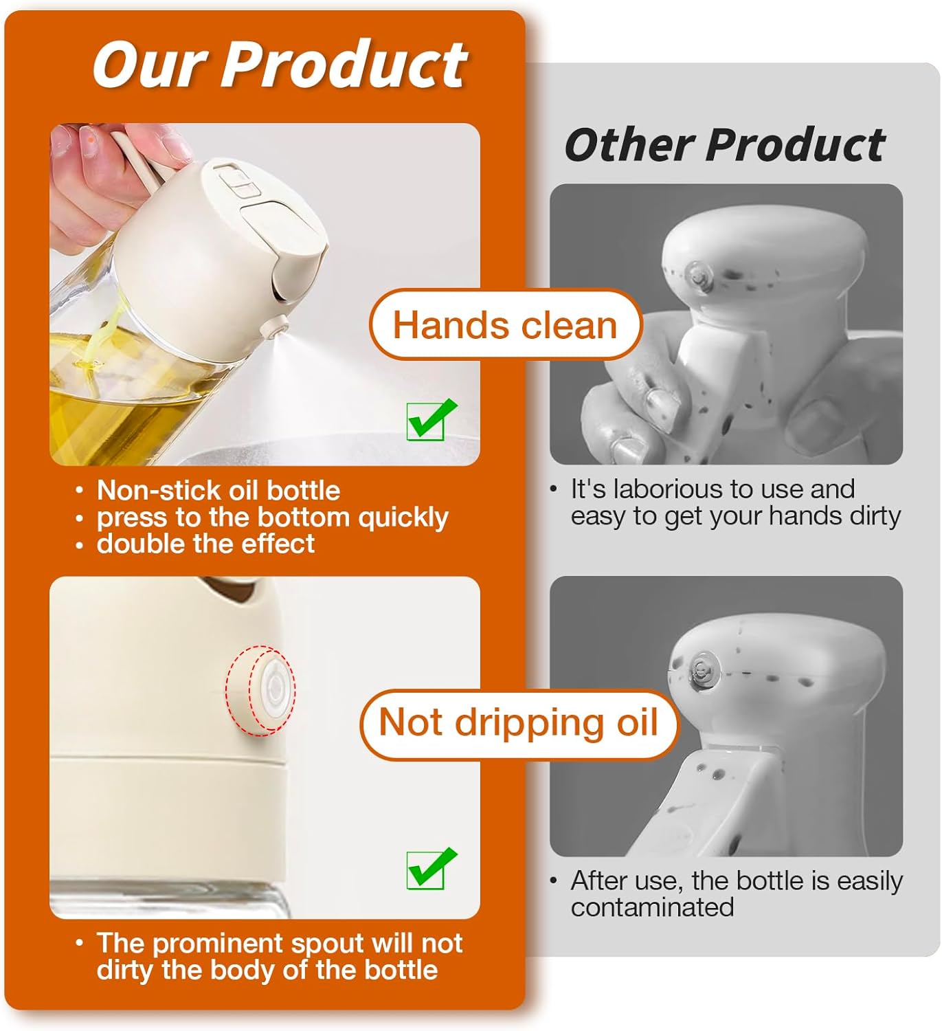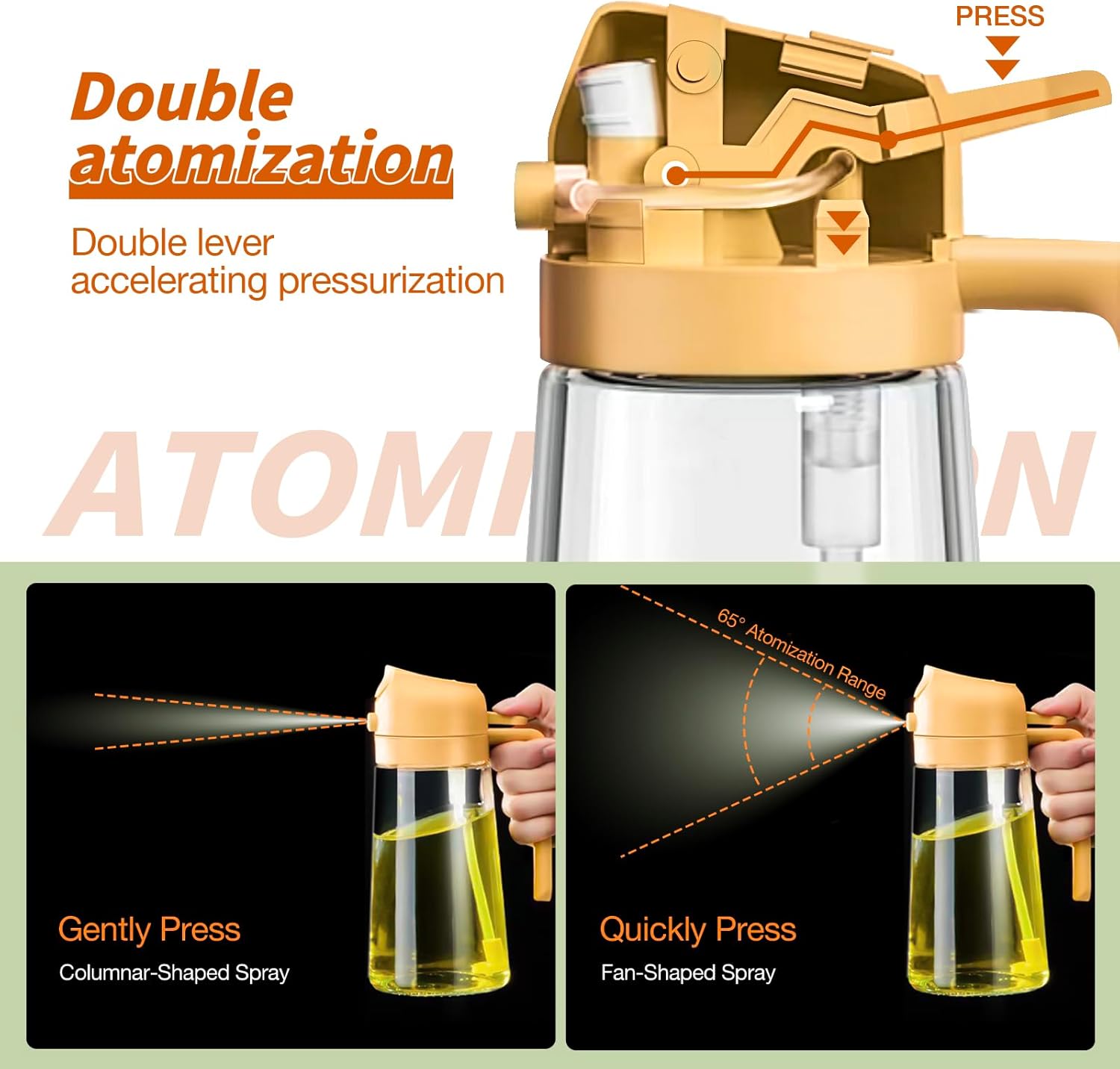 • Not Dirty Hands Design: Olive oil spray bottle is designed with the front-facing, prominent nozzle and the rear comfortable handle design enables users to achieve a fine, uniform, pure mist, users can pour or spray oil without getting their hands dirty
