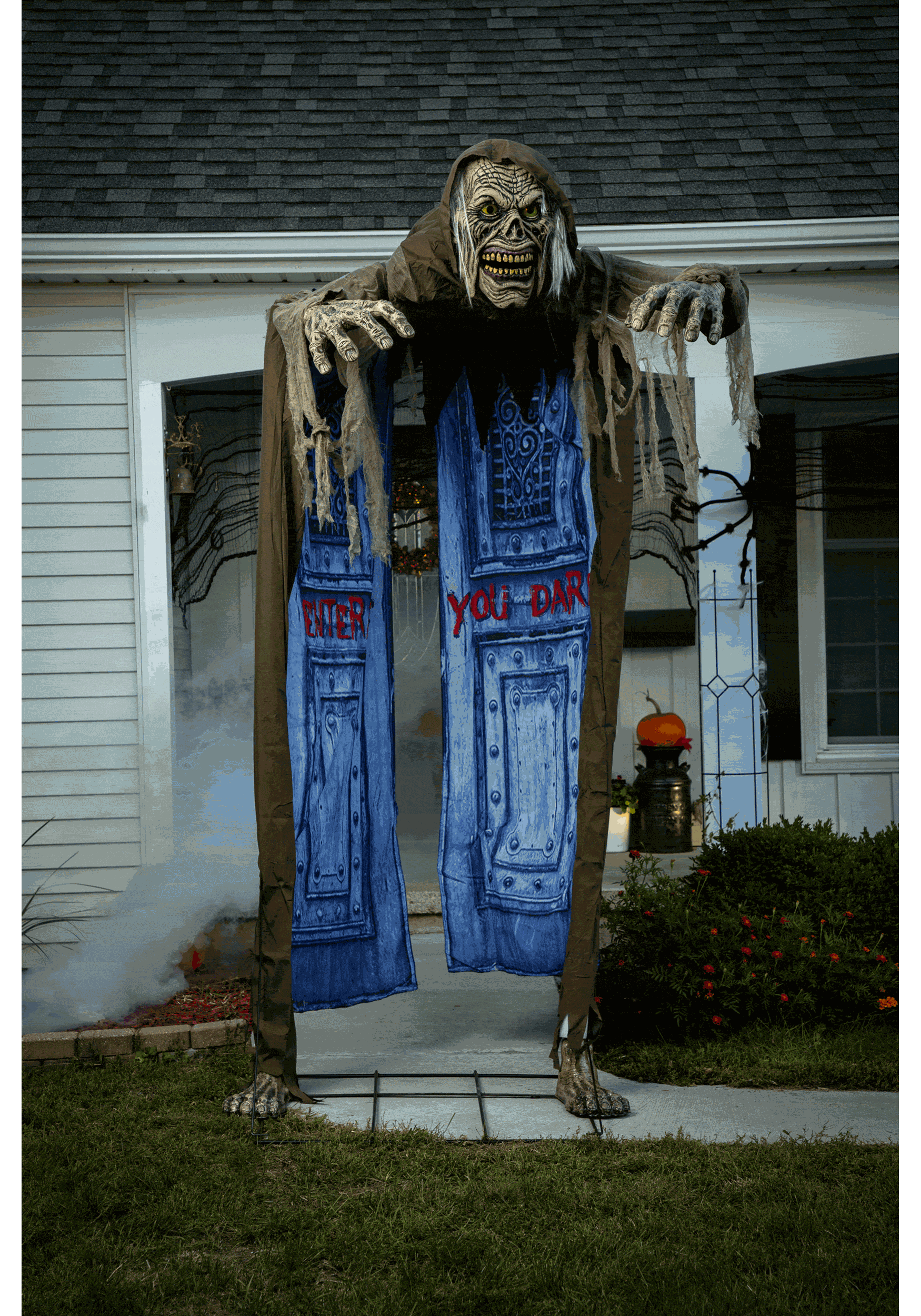 Not only does this ghoul look terrifying, but it also speaks! With five different phrases, it will send chills down your spine as it welcomes or warns your Halloween visitors. Its haunting voice will add an extra layer of fright to your haunted house or outdoor display.
