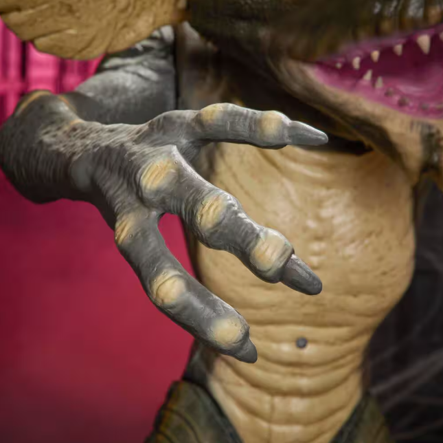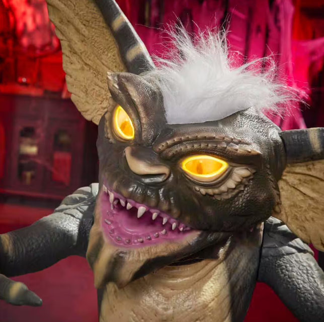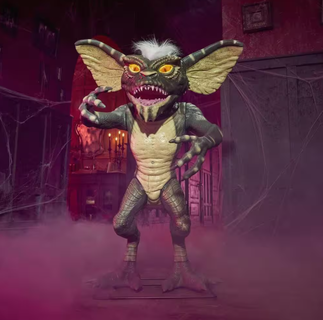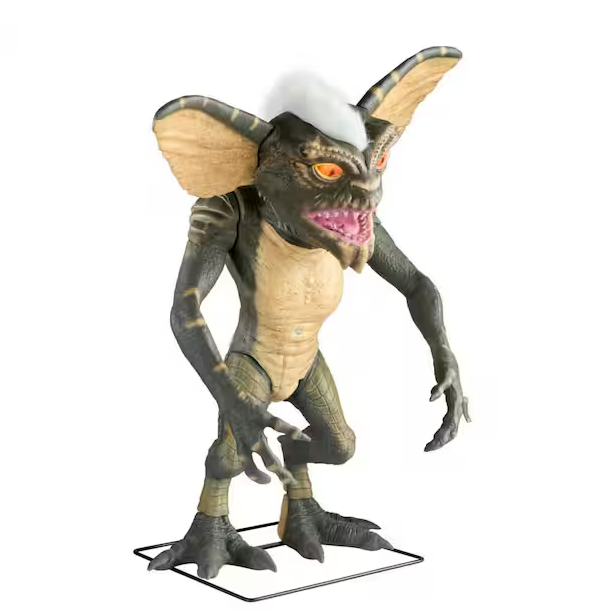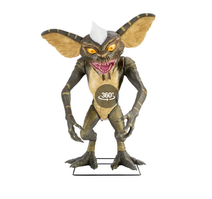 Delight fans of Gremlins with this life-size 3.5 ft. Animated LED Gremlin Stripe. Trigger the motion or sound sensor and this mohawked menace comes alive speaking phrases in true character voice. Its head turns side-to-side swinging its two giant ears. Its mouth opens showing off its pointy teeth as its orange LED eyes glow in the darkness. Up your indoor Halloween display this year with the amazing animated Gremlin Stripe figure! Includes base stand for stability. Easy setup and storage.