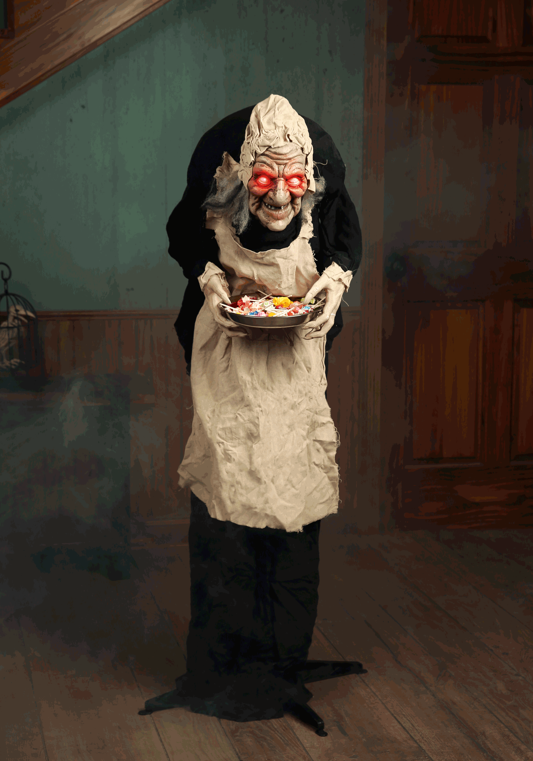 Prepare for a truly immersive experience with this animated prop. Activated by sound and a push of a button, the Old Lady Hag's eyes flash with menacing red LEDs, while her head moves up and down in a hauntingly realistic manner. As she cackles and speaks, your guests will be frozen in fear. But that's not all �� the prop comes with a metal bowl attached to her hands, ready to offer an eerie surprise to anyone brave enough to approach.