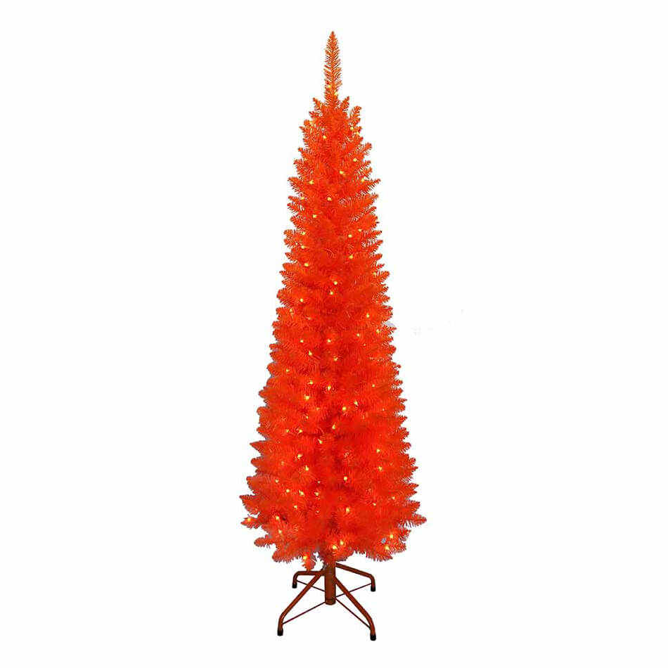 The 5 foot pre-lit Orange Slim Tree might just be the thing to add to your Halloween party decor! Especially if you want to impress your guests with a walk down a lane of bright, colorful Halloween forest trees! You could also use this tree as a centerpiece on your haunting food table, because it is great for a tabletop or placed on the floor near a Halloween display. They can be decorated with all of your Halloween theme ornaments, easily! Since the orange tree is pre-lit you just have to put the tree in its base, plug the orange tree in...and start decorating! There are two sizes, so you can add the smaller orange 4 foot tree to your displays for a spooktacular and colorful display.