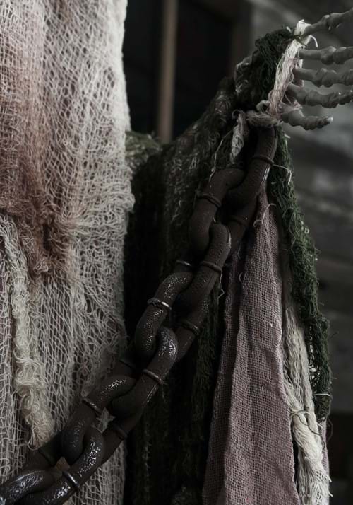 This animatronic ghoul is the epitome of haunting elegance. Its molded plastic skull features a movable jaw, allowing it to let out bone-chilling moans and groans. The skull and arms are draped in light gray and cream gauze and netting, giving it an ethereal and ghostly appearance that will send chills up your spine.