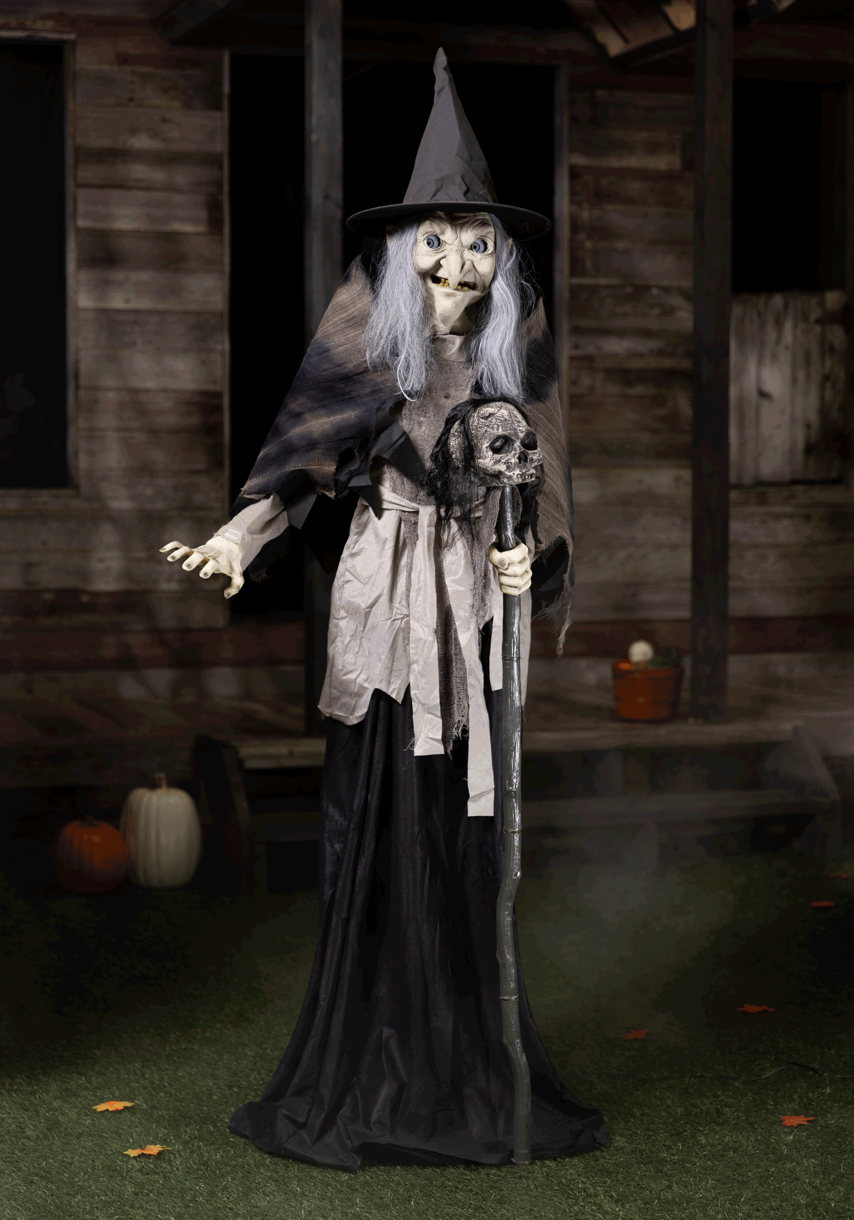 As the moon rises and the wind howls, the Halloween season is about to take a turn for the spookier. Prepare yourself for a hair-raising encounter with the 6ft Lunging Witch with DigitEye Animated Prop! This towering figure stands at an impressive 6 feet tall when assembled, ready to cast a spell of terror upon all who dare to cross her path.