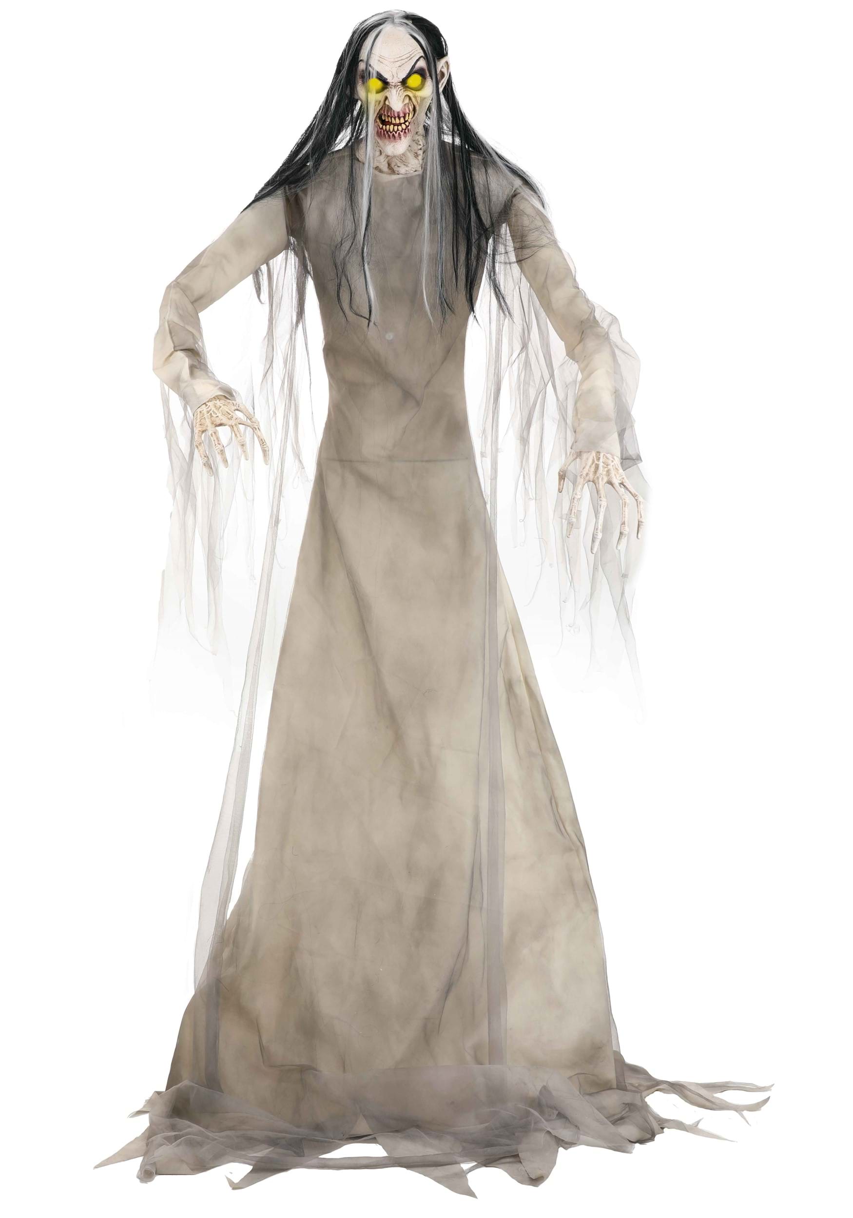 Standing at an impressive 7 feet tall, this animatronic prop is a true masterpiece of terror. The metal frame ensures durability, while the molded plastic head and hands give it an eerily lifelike appearance. Dressed in a flowing fabric robe, the Wailing Banshee is ready to frighten anyone who crosses its path.