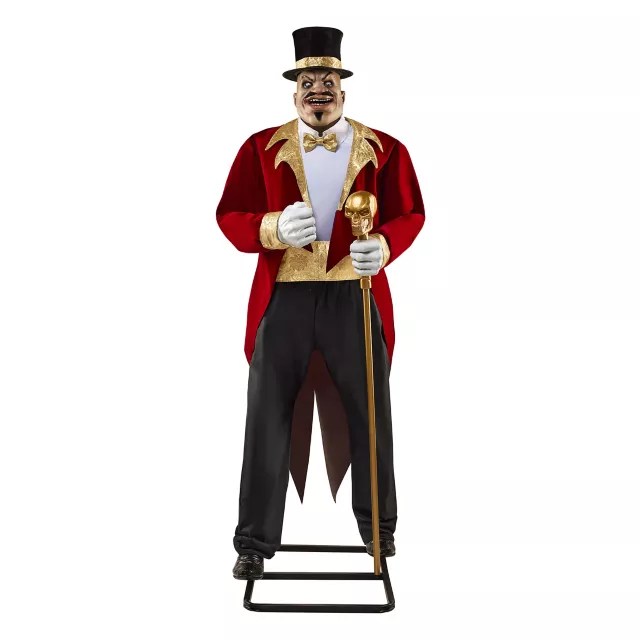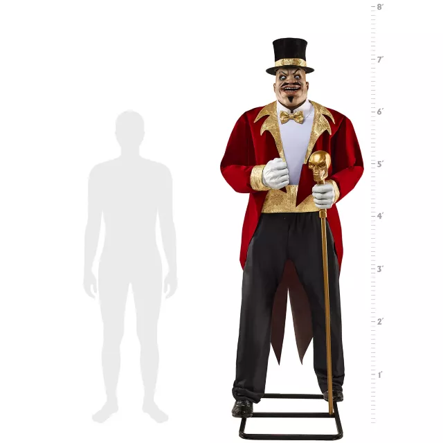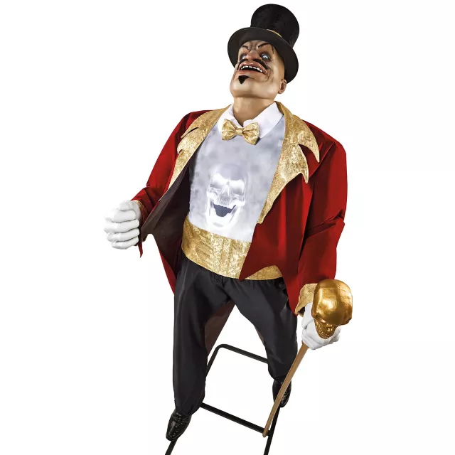 The seven-foot-tall Ringmaster speaks four menacing phrases that will send chills down your spine and tempt you to enter his wicked carnival. He also features laughing and tortured screaming sound effects, perfect for setting a sinister tone for your next haunted house. But the scares don’t end there. In fact, the show has just begun. Come one, come all and step right up as the Ringmaster opens up his arms, tilts his head back, moves his mouth, and projects swirling souls on his chest to suck you in. Then, you’ll truly know his power…and how evil he really is.