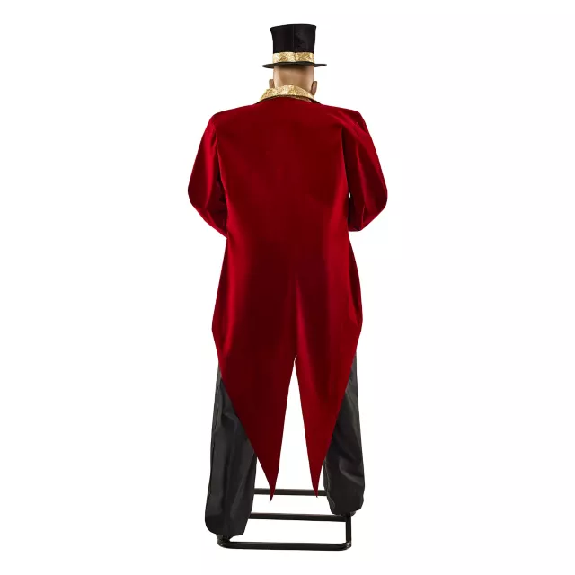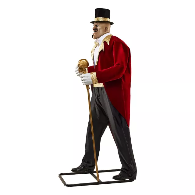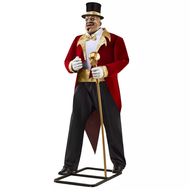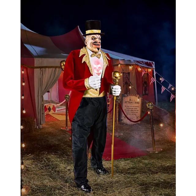The seven-foot-tall Ringmaster speaks four menacing phrases that will send chills down your spine and tempt you to enter his wicked carnival. He also features laughing and tortured screaming sound effects, perfect for setting a sinister tone for your next haunted house. But the scares don��t end there. In fact, the show has just begun. Come one, come all and step right up as the Ringmaster opens up his arms, tilts his head back, moves his mouth, and projects swirling souls on his chest to suck you in. Then, you��ll truly know his power��and how evil he really is.