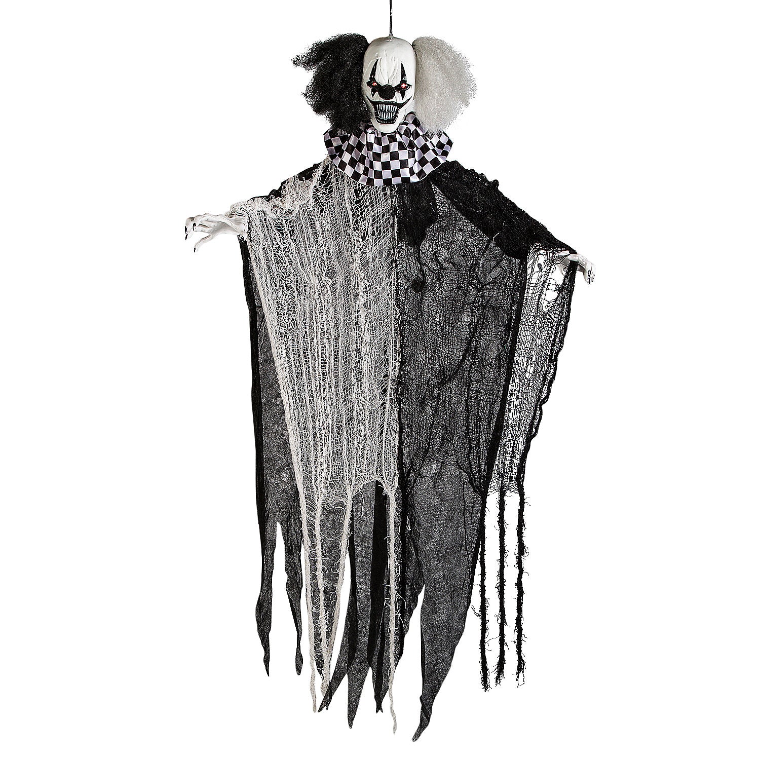 Creepy clowns are a classic Halloween theme and this quintessential example is sure to freak out guests to your home haunt or Halloween party this year. Simply hang the maniacal clown from the rafters of your front porch or backyard pergola to create a crazy carnival motif for your event. Featuring stark contrasting colors of black and white, including face paint, hair, and checkered ruffle collar, the eyes glow red when the animatronic is activated. Trick-or-treaters will giggle with surprise as they experience the hilarity of this funny Halloween decoration as it wiggles around while spouting silly insults. Phrases include: