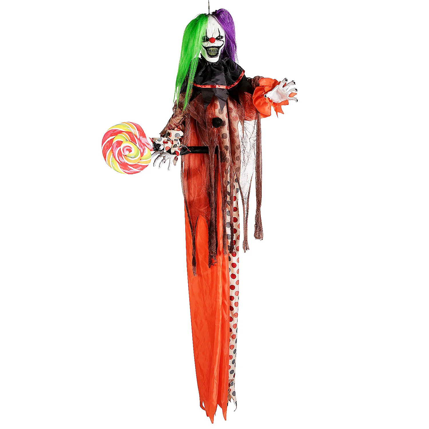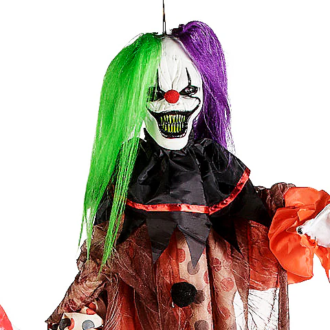 Step right up! Welcome to a carnival of terror! With green and purple hair, orange and black clothing, and a pale face with a menacing grin and spiky teeth, this hanging animatronic Halloween decoration will be the highlight of your trick-or-treat station, yard haunt display, or seasonal party decor. Like something out of a carnival barker nightmare, this scary clown features bright colors that will add a pop of bright energy (and maybe a little menace) to your haunted house decor, and the light-up eyes will catch guests�� attention when the sun starts to set on Halloween night. This hanging decoration shakes and wiggles about and its eyes light up when activated, creating a fun jump-scare for all those nearby.