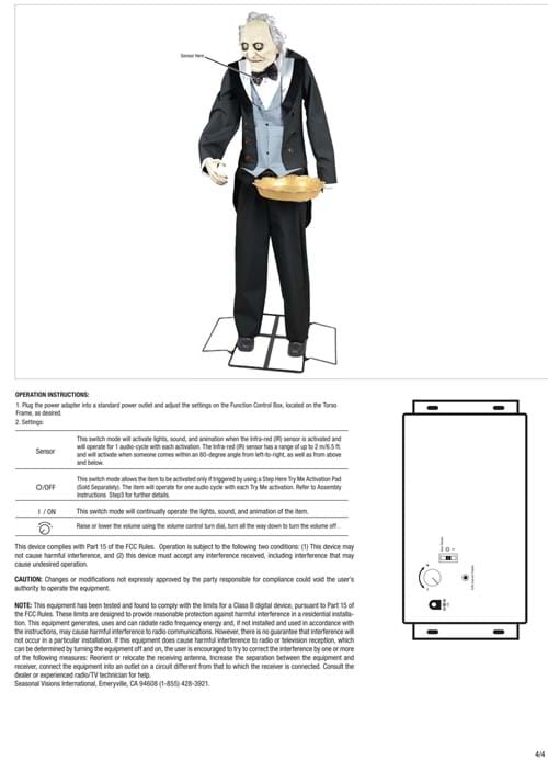 Adjust the volume of the spine-tingling sounds by simply turning the knob on the control box. Whether you want a subtle spook or a bone-rattling scream, you're in control. The Evil Animated Greeter Butler conveniently plugs into any standard US wall outlet, making setup a breeze. Please note that the plug on this item may require an adapter (not included) for use outside the United States.