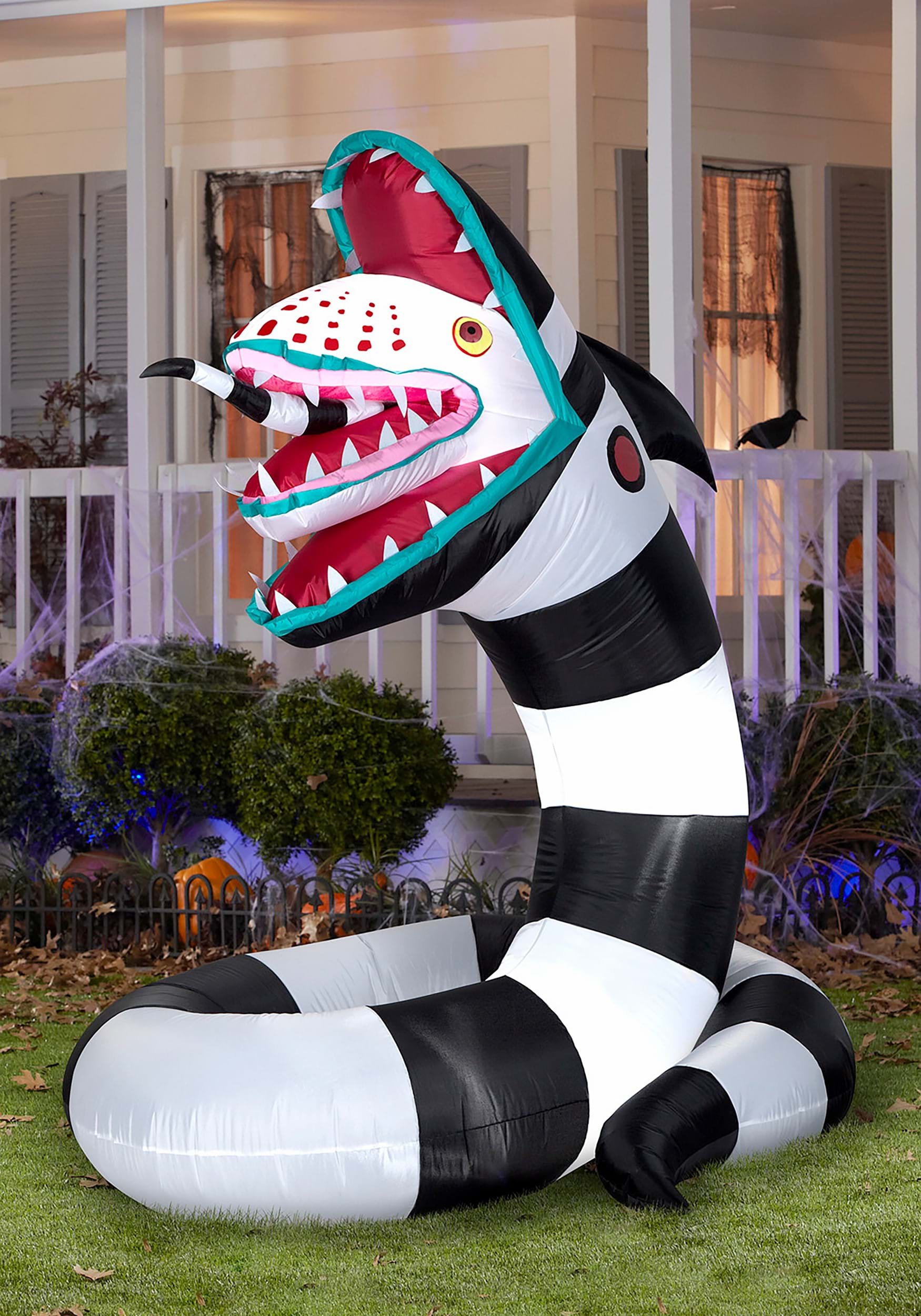 As an officially licensed Beetlejuice product, this Sandworm inflatable brings authentic movie magic to your home. Fans of the classic film will appreciate the attention to detail, from the Sandworm's fearsome teeth to its distinctive stripes. This decoration celebrates the cult classic in all its quirky glory. Embrace the spirit of Beetlejuice and let this monstrous Sandworm take your Halloween decorations to the next level.