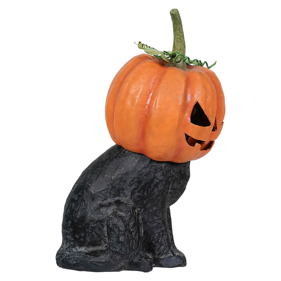 A Bethany Lowe design. Two classic symbols of Halloween come together in this Black Cat Jack O' Lantern decoration. This spooktacular piece of artwork is truly something special. Crafted from paper mache, this duo feels like a truly nostalgic piece of Halloween. The frightening pumpkin can be put on the cat's head to make some Halloween mischief or be placed next to the cat to look inconspicuous after a night of scares! This delightful piece of Halloween decor is a surefire centerpiece of any display you put him in. If you are a cat enthusiast, you can even leave the cat portion of this piece out all year long!
