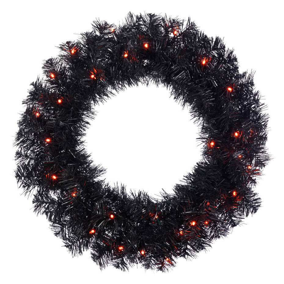 The perfect wreath to add to your Halloween decor! The Black Halloween Lighted Wreath comes with orange lights and a timer so you won't forget to turn it off once you turn it on when greeting guests or trick or treaters. You certainly could decorate the black wreath, with Halloween ornaments or basic fall leaves, acorns and pumpkins. It is convenient and will take you from year to year adorning your front door, a wall or above your mantel. Pair it with the Black Halloween Lighted Garland that also comes battery operated and with orange lights over a doorway or strung along a mantel.