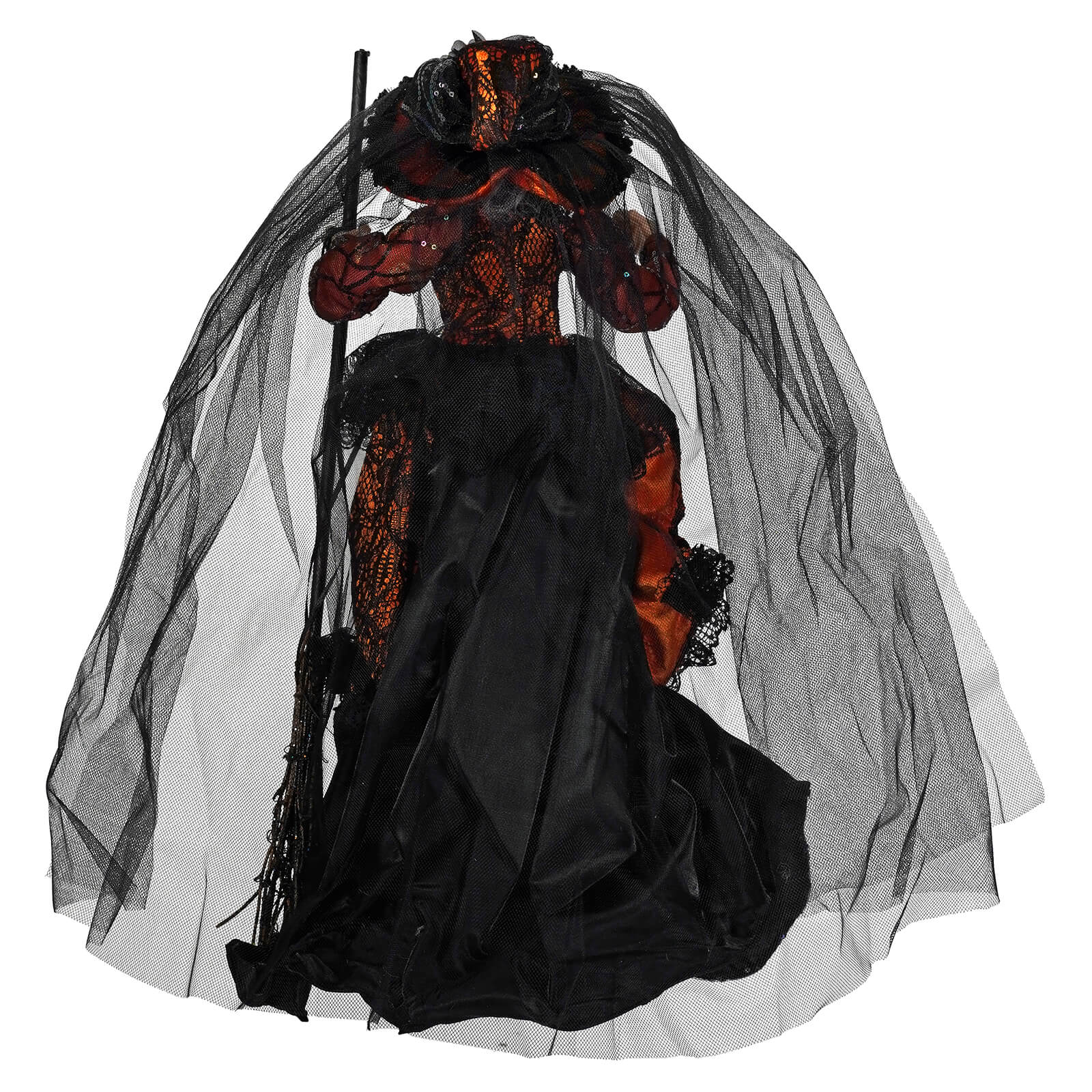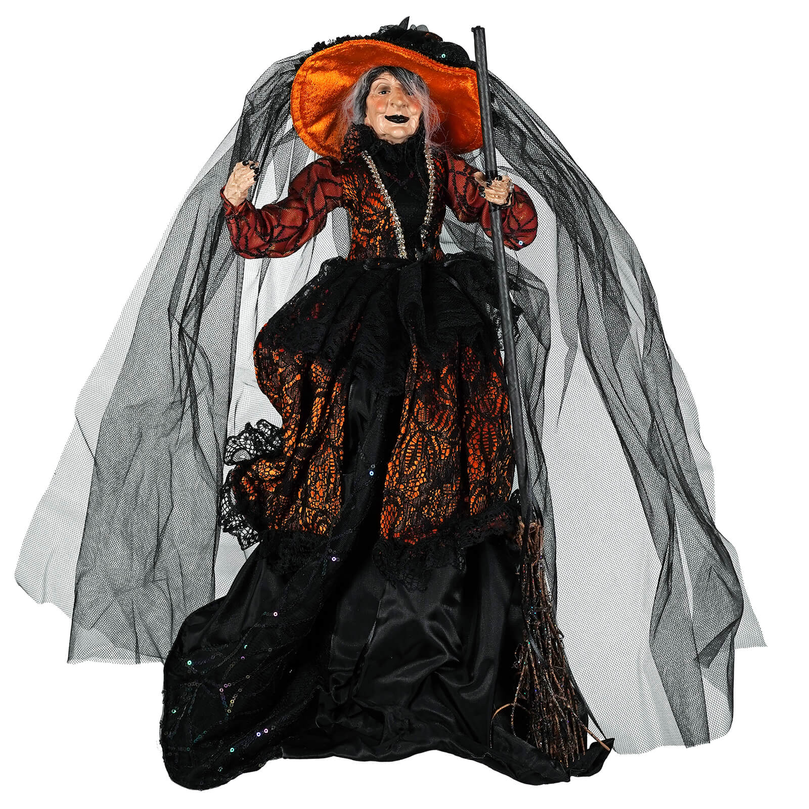 A little long in the tooth, this Black & Orange Dressed Witch Holding Broom doesn't take any guff from the trick or treaters that come to her door. Her lacy black and orange dress and long, flowing train of netting coming from her witch hat make it look like she's just stepped off her broom after a moonlit flight. The detail in her face and sparkly sequin accents are super eye-catching, ensuring she will be a stand out piece in your Halloween figure collection!