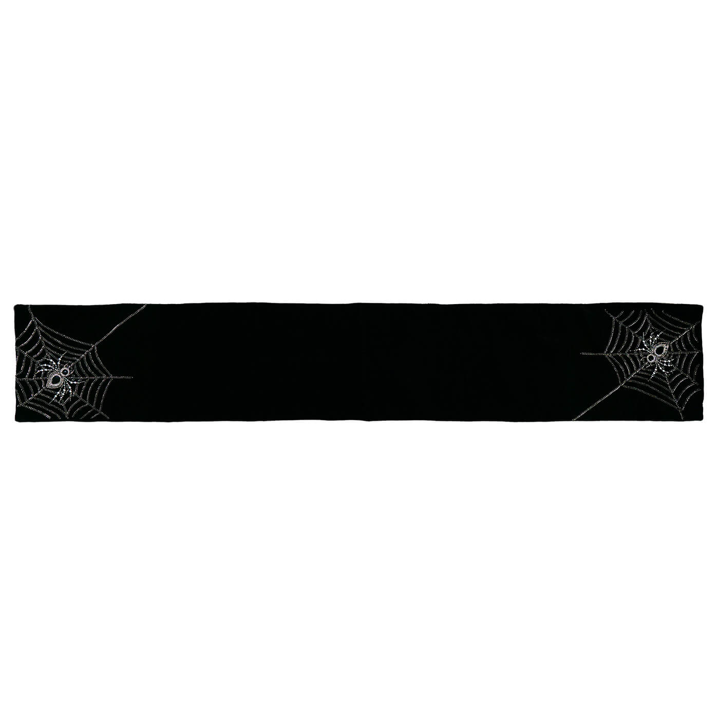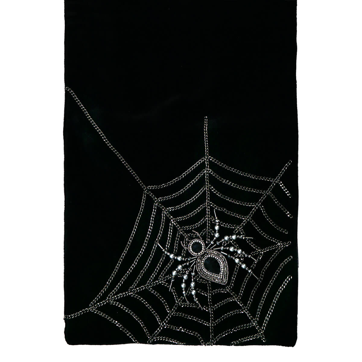 Spooktacular!!! When we saw this elegant, but haunting table runner we knew it would be a best seller! The Black Velvet Table Runner with Chain Web and Beads will elevate your Halloween decor to a new level. Whether you place it down the middle of your dining table (can't you just see your elegant china, platinum silverware and gorgeous goblets adorned by the runner!) or on a sideboard, where you can display some of your finest Halloween collectibles, you won't be disappointed. It truly is just stunning. The Chain Web and Bead work are expertly done, even though they are only on the edges of the runner, it is just the right amount. A large silver beaded spider sits in the middle of each web, almost giving you the impression that is spinning even a larger web on your runner. Trust us, you won't be disappointed in this beautiful Halloween runner.