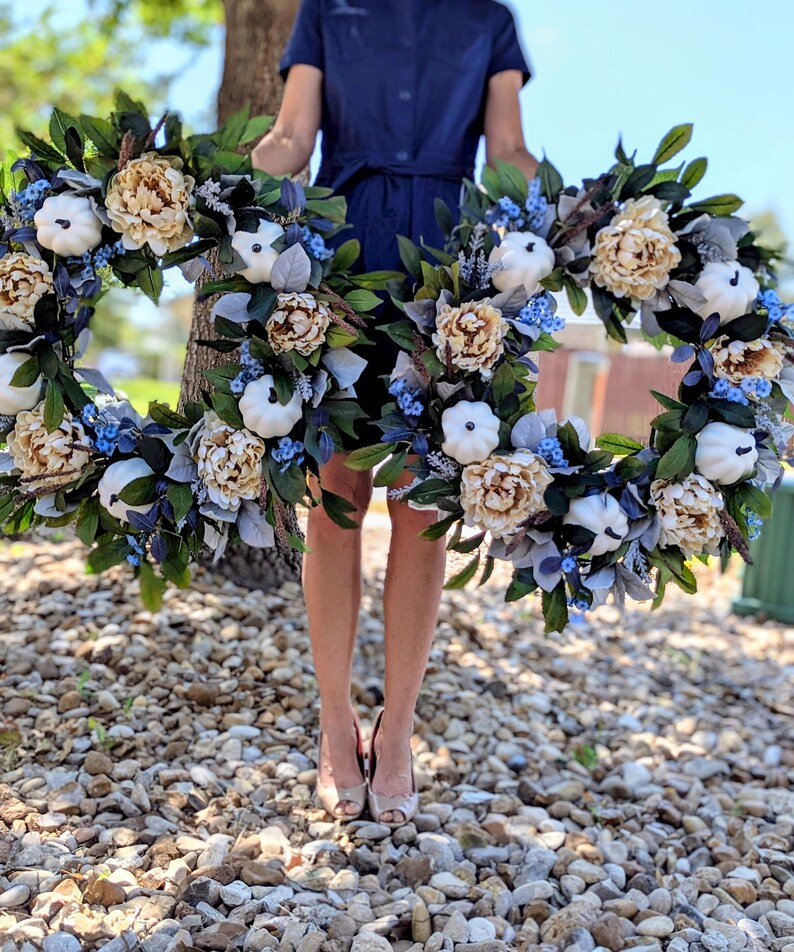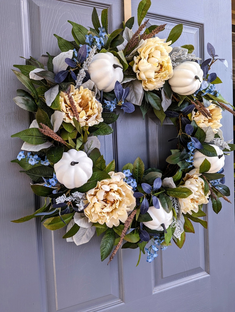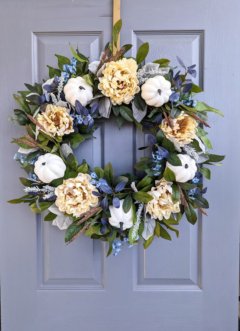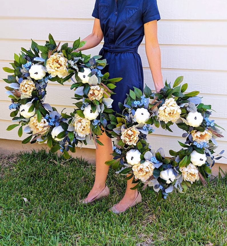 While this is a modern fall palette, this style of wreath would go with traditional, farmhouse, and modern styles of decor. The creamy peonies and white pumpkins add the neutrality which is so popular in decor, while the pops of blue tie things together with blue toned doors and decor. This wreath would also be stunning on grey and white/cream backgrounds.