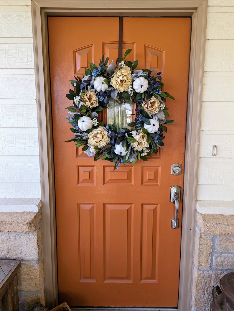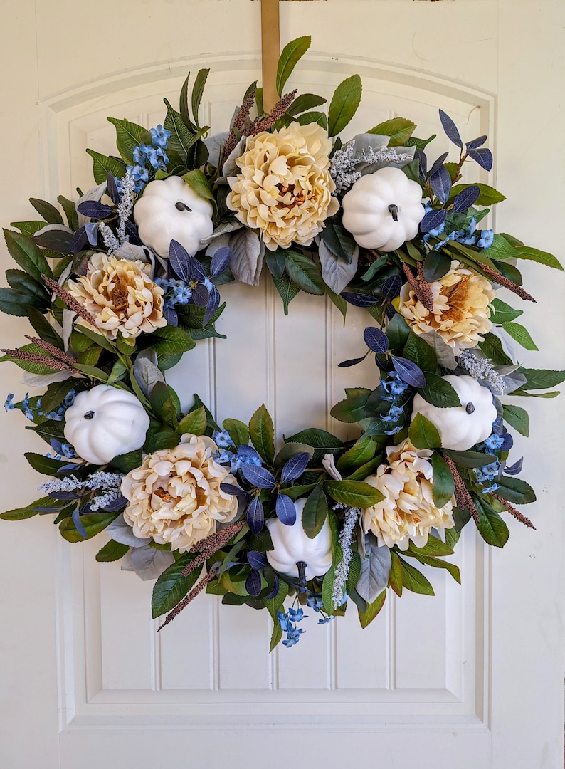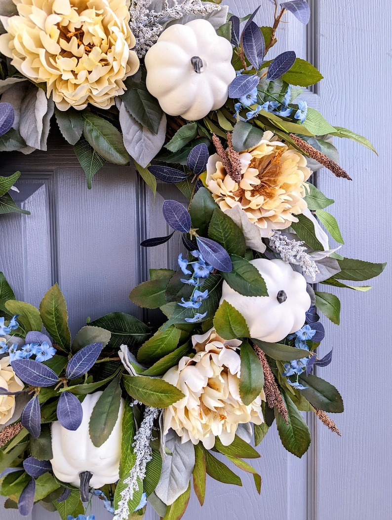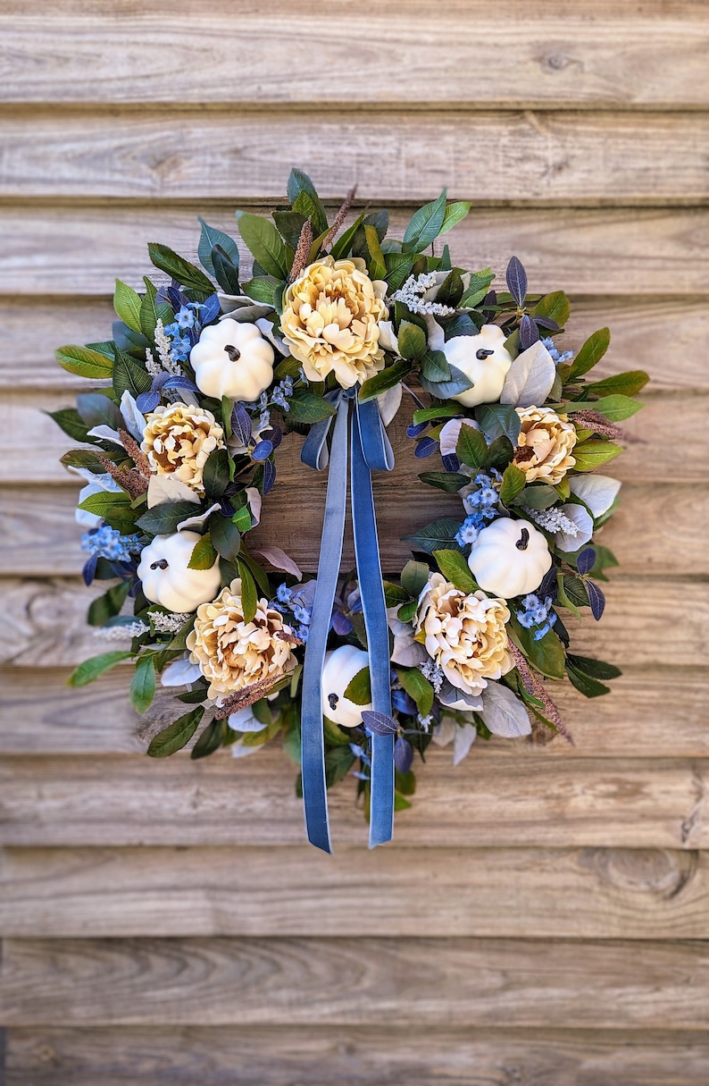 While this is a modern fall palette, this style of wreath would go with traditional, farmhouse, and modern styles of decor. The creamy peonies and white pumpkins add the neutrality which is so popular in decor, while the pops of blue tie things together with blue toned doors and decor. This wreath would also be stunning on grey and white/cream backgrounds.