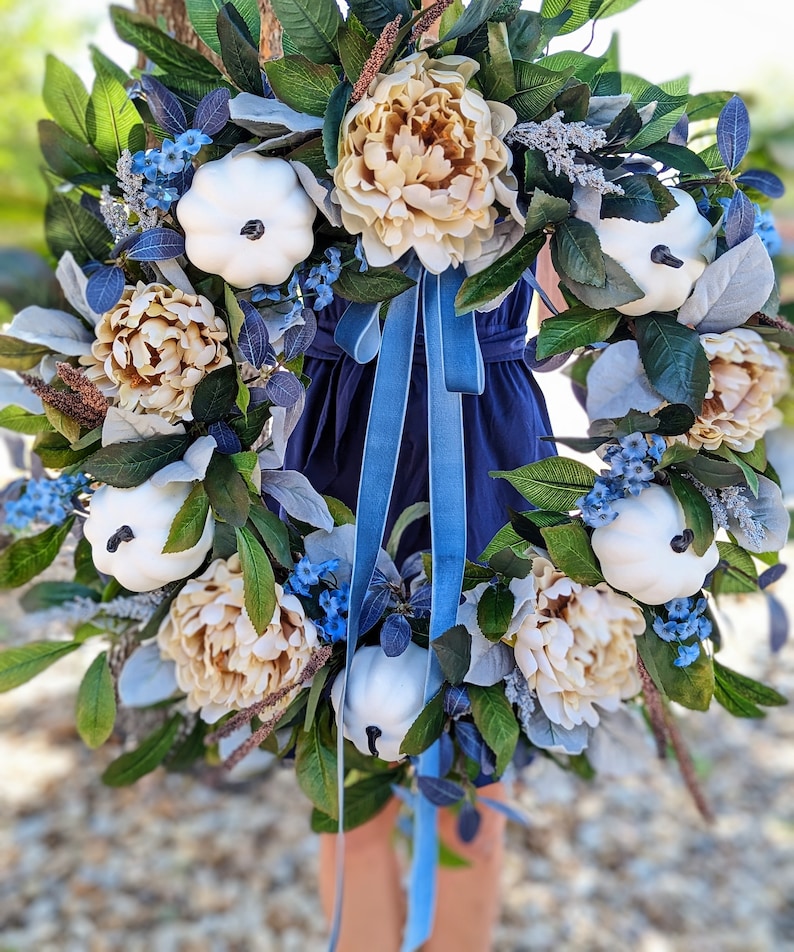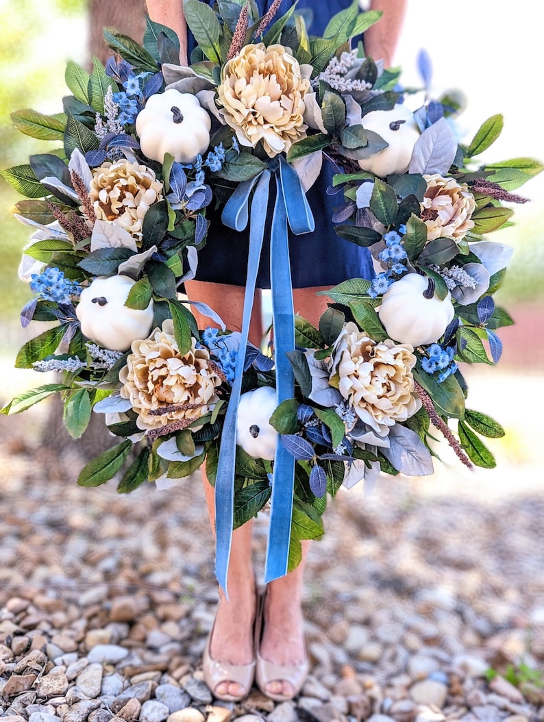 I've started with a combo of warm and cool toned lush fall foliage for a base. To that is added bright white pumpkins, large cream peonies, and pops of blue in the form of berries, wildflowers, and leaves. A final pop of long brown wheat berries adds a subtle feel of fall without feeling too over the top. Add an optional velvet blue skinny bow for additional "blue". This large wreath is the only thing you need to bring some elegance and gentle blue fall tones to your porch or decor.