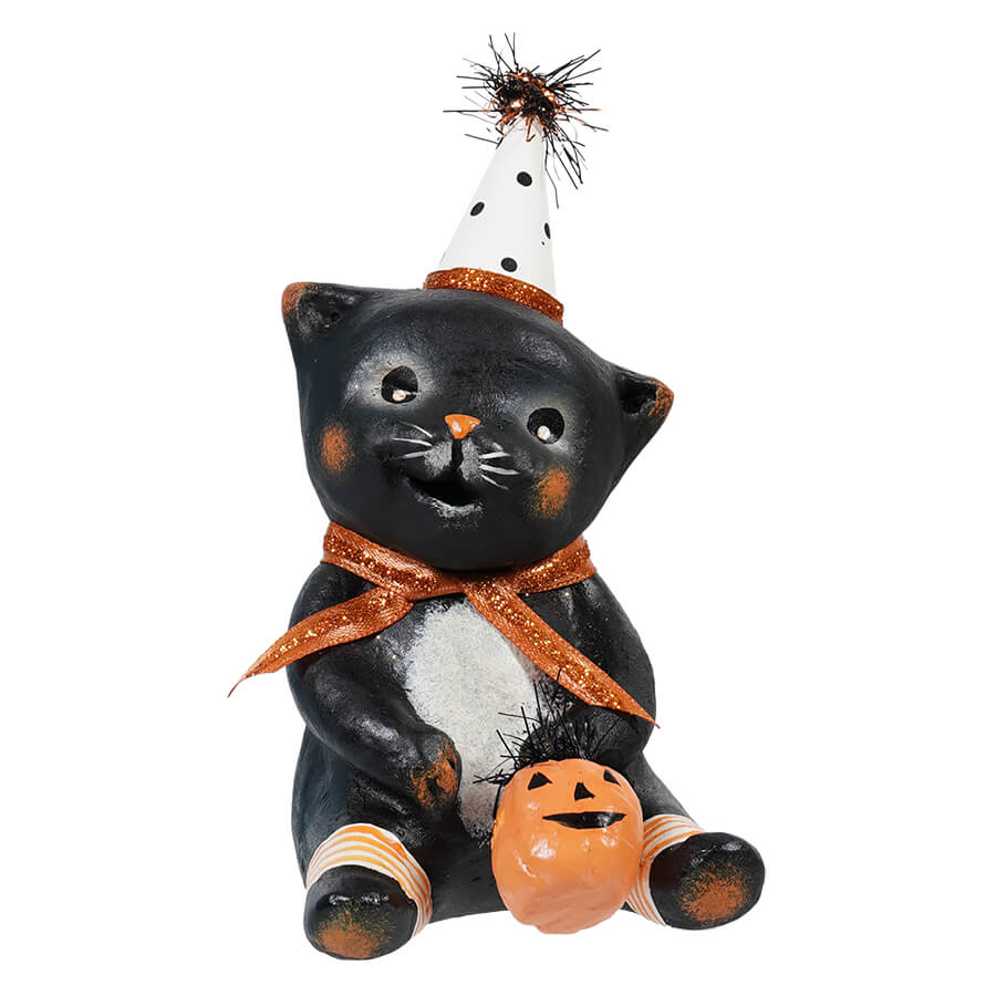Such a sweet face, Boots Halloween Party Kitty is certainly not a scary figure for Halloween! You just want to hug this Michelle Allen design, we think it is a testament to how Michelle must be in real life. All of her figures are just so precious, there is nothing scary or mean about them and this little guy is no exception. We love to gather a few of her Halloween cats and ghosts together and surround them with candy corn colored bottle brush trees on a shelf or tabletop. Boots Halloween Party Kitty, in his white and black dotted party hat and holding a smiling pumpkin bucket, will make a terrific addition to any display in your home.