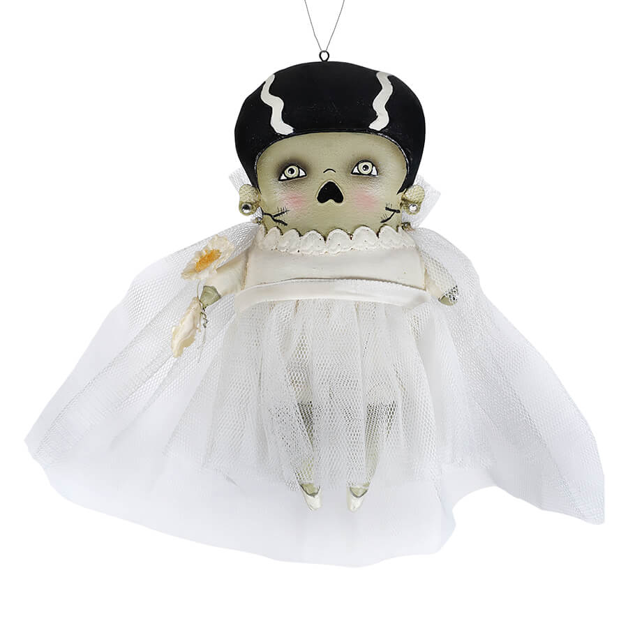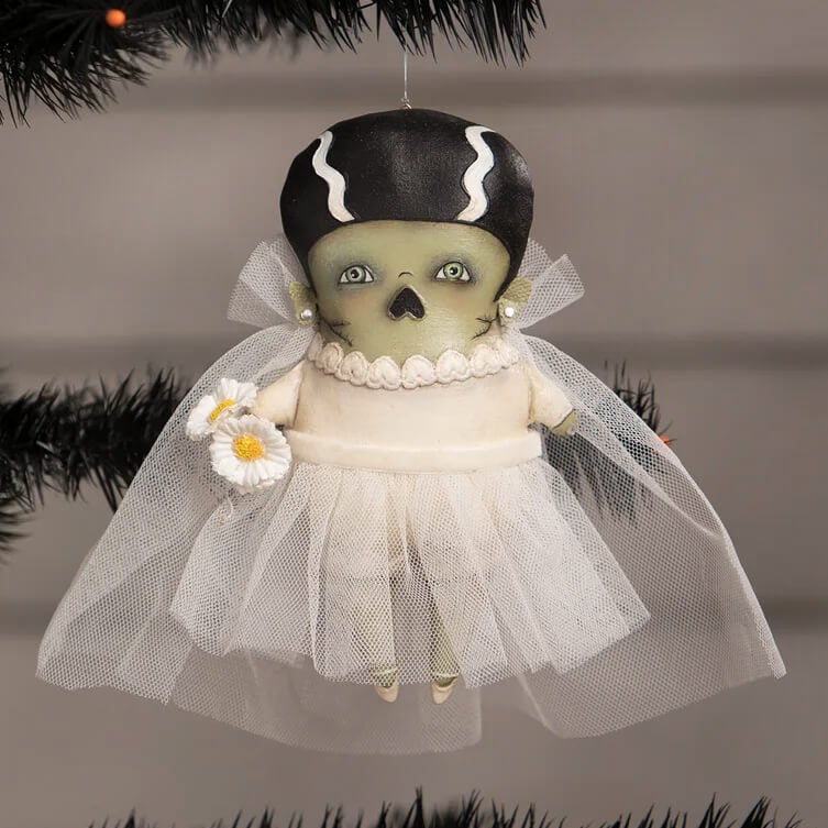 Here comes the Bride!! Apparently. Frank Boris Ornament won the hand of Bride Elsa Ornament and all of the details are there! She is part of the Robin Seeber collection of ornaments that we just adore! Not only are they as cute as can be, but those expressive faces just draw you to the Halloween tree you will hang them on! Bride Elsa Ornament accepted Frank Boris's (RS1113) proposal and his little white daisy. She has a tiny faux diamond on her left hand and dotting her ears too. It looks like Frank Boris's wooing paid off! Bride Elsa Ornament is made of hand painted resin, she is a hard ornament, not squishy like fabric, but is draped in netting to complete her bridal outfit. Of course you can hang this fun ornament on your Halloween tree, but it would also look fabulous on a mantel garland draping your fireplace. She is such a fun ornament!
