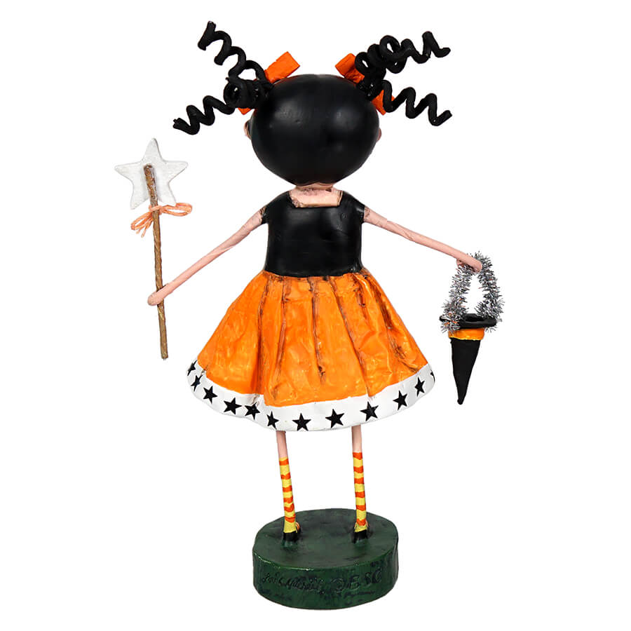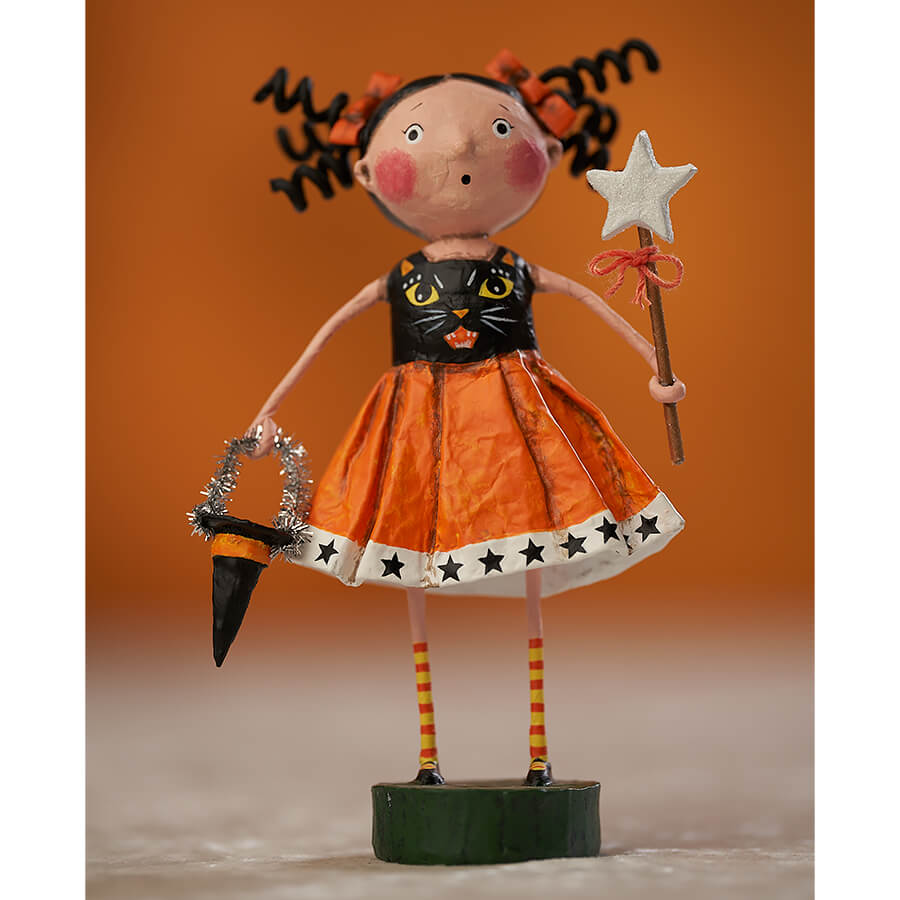 Her costume really is the Cat's Meow!!! Every year she diligently starts drawing quite a few different costume ideas the minute Halloween is over, then throughout the summer she culls the list down until she can pick her favorite. This year she settled on the Cat's Meow, a Lori Mitchell figure for ESC and Company. She got a new kitty right around Halloween last year, so she drew it's scaredy cat face on the bodice of her dress, no wonder it was her favorite costume...she loves that kitty so much! Another great trick or treat figure from Lori Mitchell to add to your Halloween figure collection.