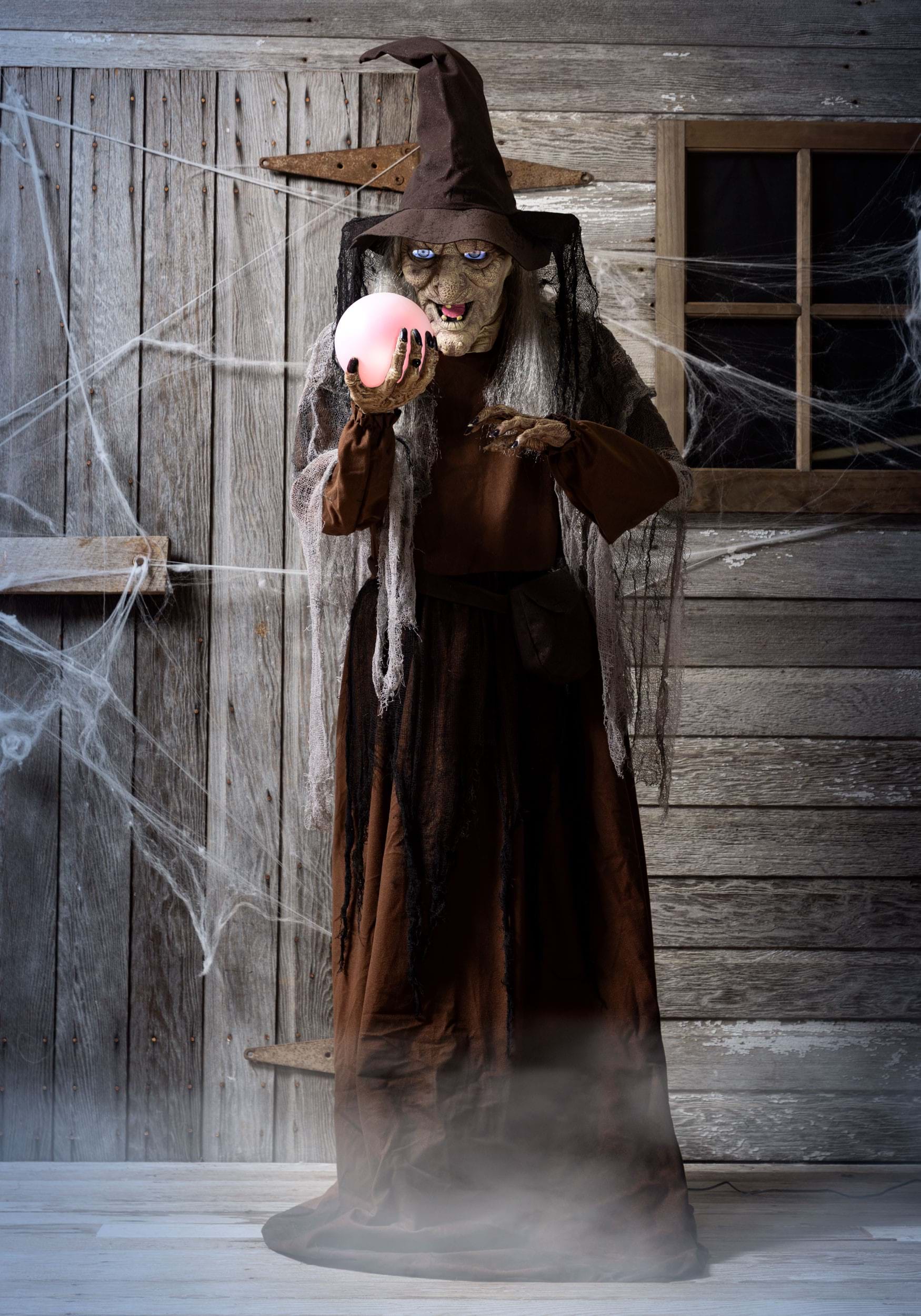 When activated, the Soothsayer Witch comes to life with her piercing gaze. Her eyes and crystal ball light up, illuminating the darkness and adding an eerie ambiance to your haunted scene. With her head and left hand in motion, she captivates all who dare to cross her path. And as if that wasn't enough, she also speaks 5 bone-chilling phrases that will send shivers down your spine!