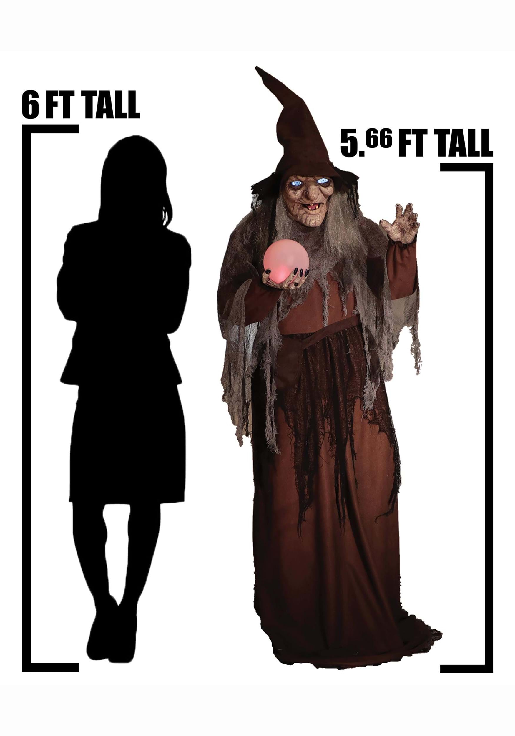 Prepare to be enchanted by the mystical powers of the 68 Inch DigitEye Soothsayer Witch Animated Prop. Standing at an impressive 68 inches tall when assembled, this bewitching figure is ready to cast a spell on your Halloween festivities!