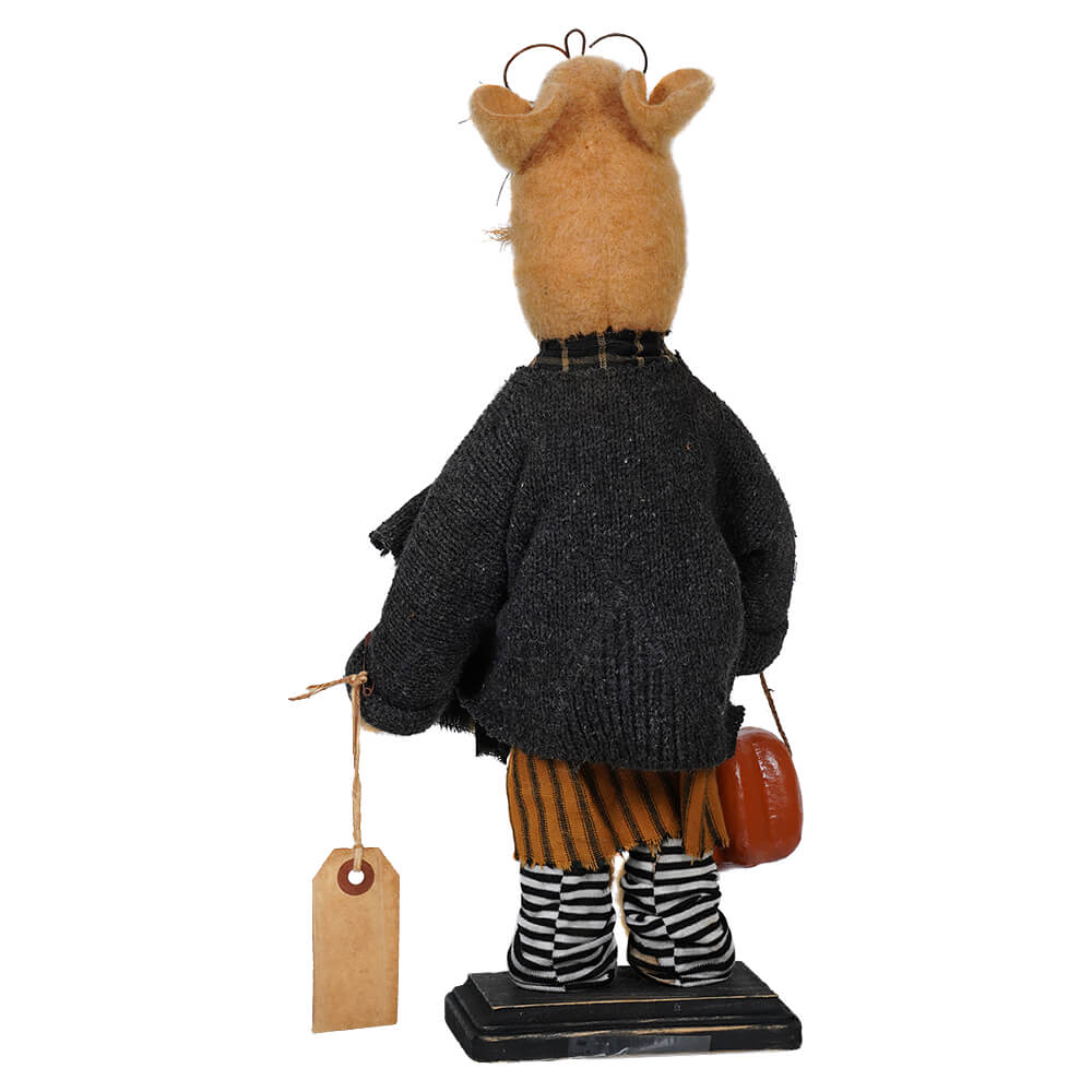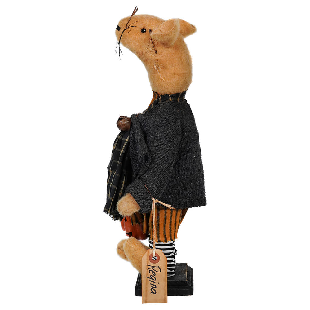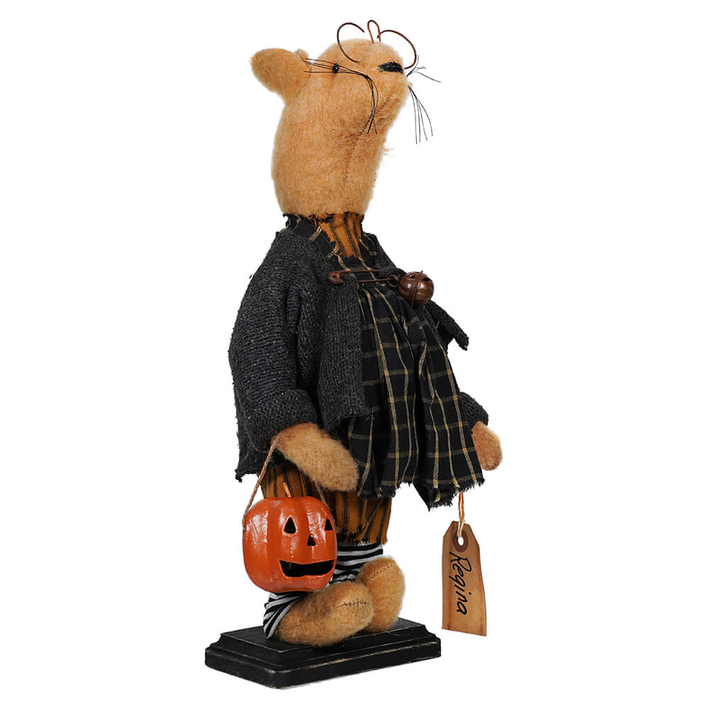 This one-of-a-kind piece stands 16” tall and radiates coziness and comfort with its repurposed fabric design, tea staining and scented batting. Regina also comes with her own hanging tag from her wrist, just in case she forgets who she is while out trick or treating! This vintage look also captures autumn in all of its glory and channels a whimsical Halloween spirit. It’s perfect for adding an endearing look to any room – now who wouldn’t want that?