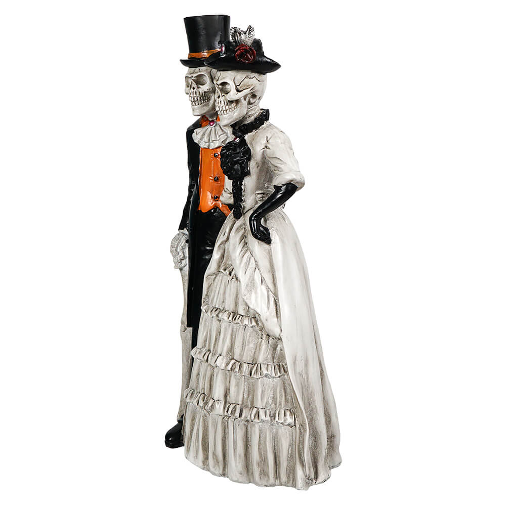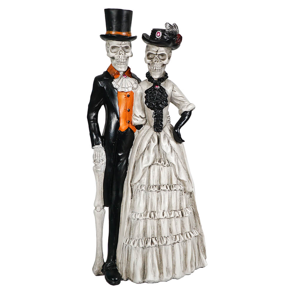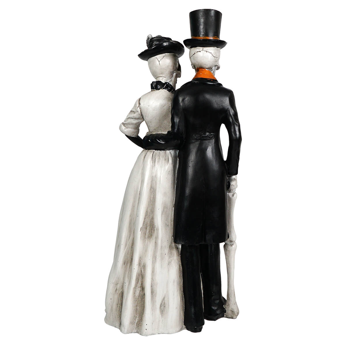 Out for a stroll on this fine Victorian evening, the Formal Dressed Skelton Couple is seen turning heads. Of course they think it is because they look so dapper in their formal wear, but we all know it is because people are shocked that this skeleton couple took the "till death do us part" section of their wedding vows very seriously! The gentleman looks dapper in his black top hat and tuxedo with frilly cravat over an orange shirt while the bony bride looks stunning in her chapeau and layered white wedding gown. Poised as if ready to take their first selfie photo, the gentleman stands with his bone walking cane as the lady poses with her shiny black gloves. How could anyone object to the union of this couple this Halloween!