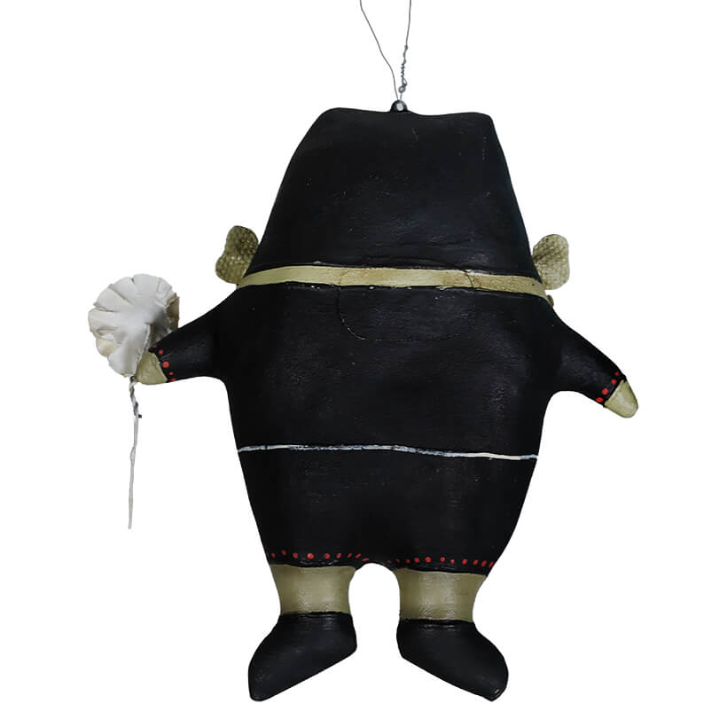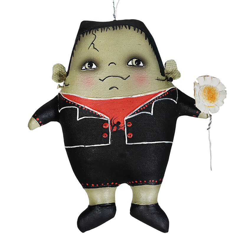 This might just be the cutest Frankenstein ornament you will ever see. Frank Boris Ornament is part of the Robin Seeber collection of ornaments that we just adore! Not only are they as cute as can be, but those expressive faces just draw you to the Halloween tree you will hang them on! Frank Boris Ornament has set his sights on his Bride Elsa (RS1112). Frank Boris offers her a white daisy in hopes of wooing her! Complete with those teeny tiny little bolts on the side of his neck and flat top haircut, his smiling eyes are perfection! Of course you can hang this fun ornament on your Halloween tree, but it would also look fabulous on a mantel garland draping your fireplace. Frank Booris Ornament is made of hand painted resin, he is a hard ornament, not squishy like fabric. Such a fun ornament!