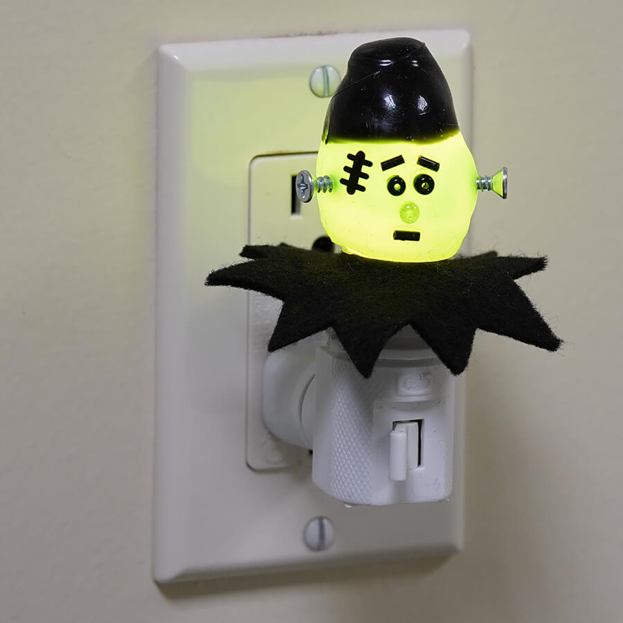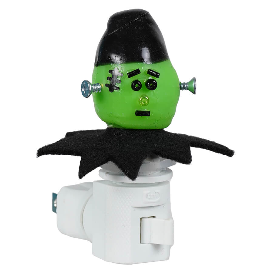 With metal bolts in the side of his head, Frankie is use to having a big jolt of electricity flowing through him! Frankie The Stein Nightlight Friend has a cute face made of beads with a felt neck ruff that catches your eye, but he really comes alive when you plug him into a wall socket anywhere in the home or workplace. His soft green glow adds just the right amount of spooky ambiance during the Halloween season, or even all year round if you're so inclined!