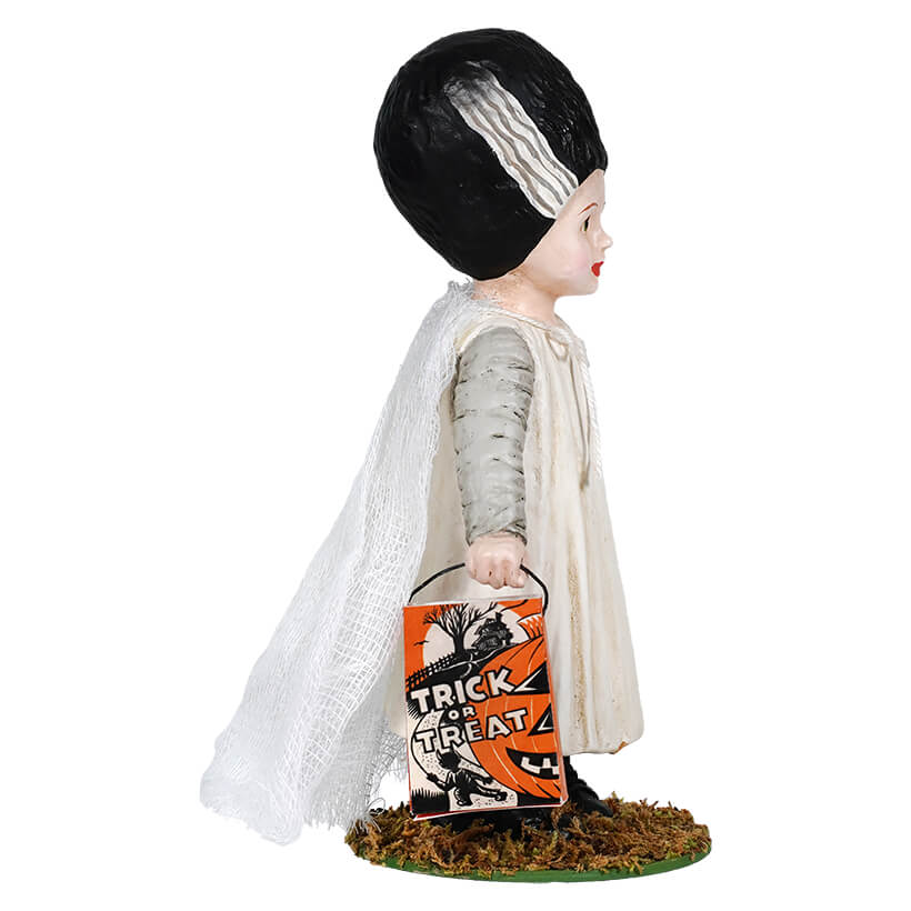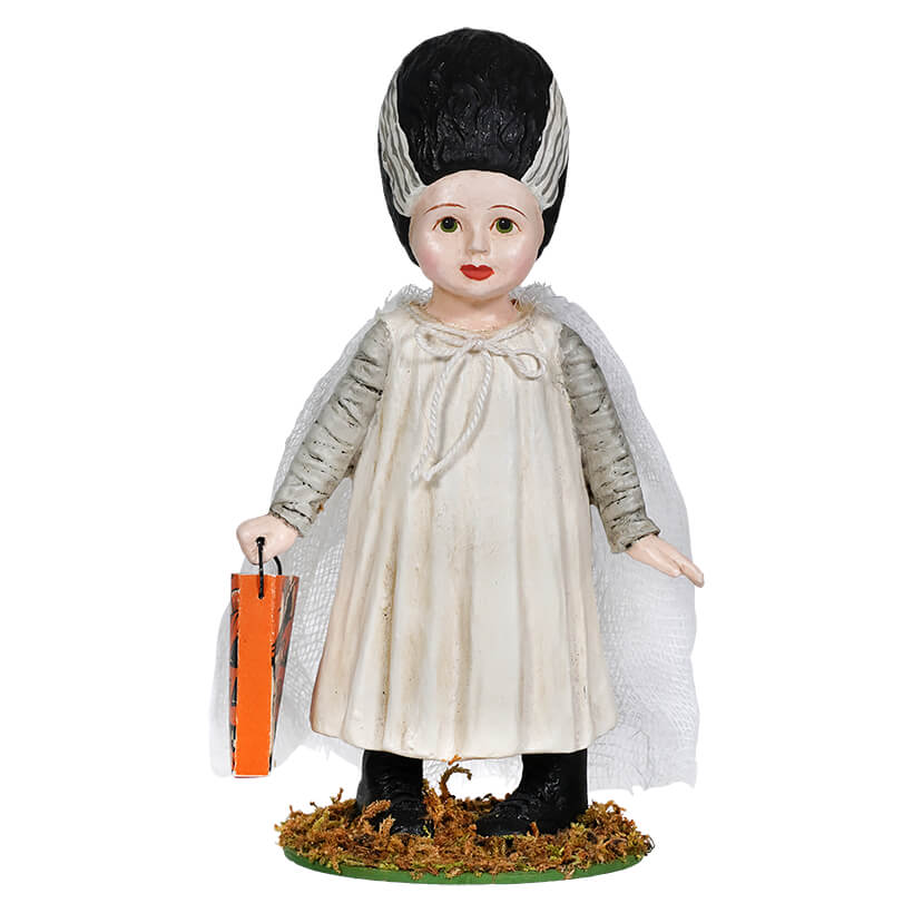 If you want to create a charming Halloween display with a nostalgic feel, you can add Friedastein Lucy to your setup. She is dressed as the Bride of Frankenstein and is all set to go trick or treating. Lucy's stunning white dress and gauzy cape are sure to captivate onlookers, along with that iconic hairstyle there will be no mistaking what she is dressed as! To complete her look, a bright orange vintage style trick or treat bag, which is sure to evoke nostalgic memories of your own childhood Halloween trick or treating! Add her to a group of Bethany Lowe’s other Halloween children figurines to create a fun little trick or treating display!