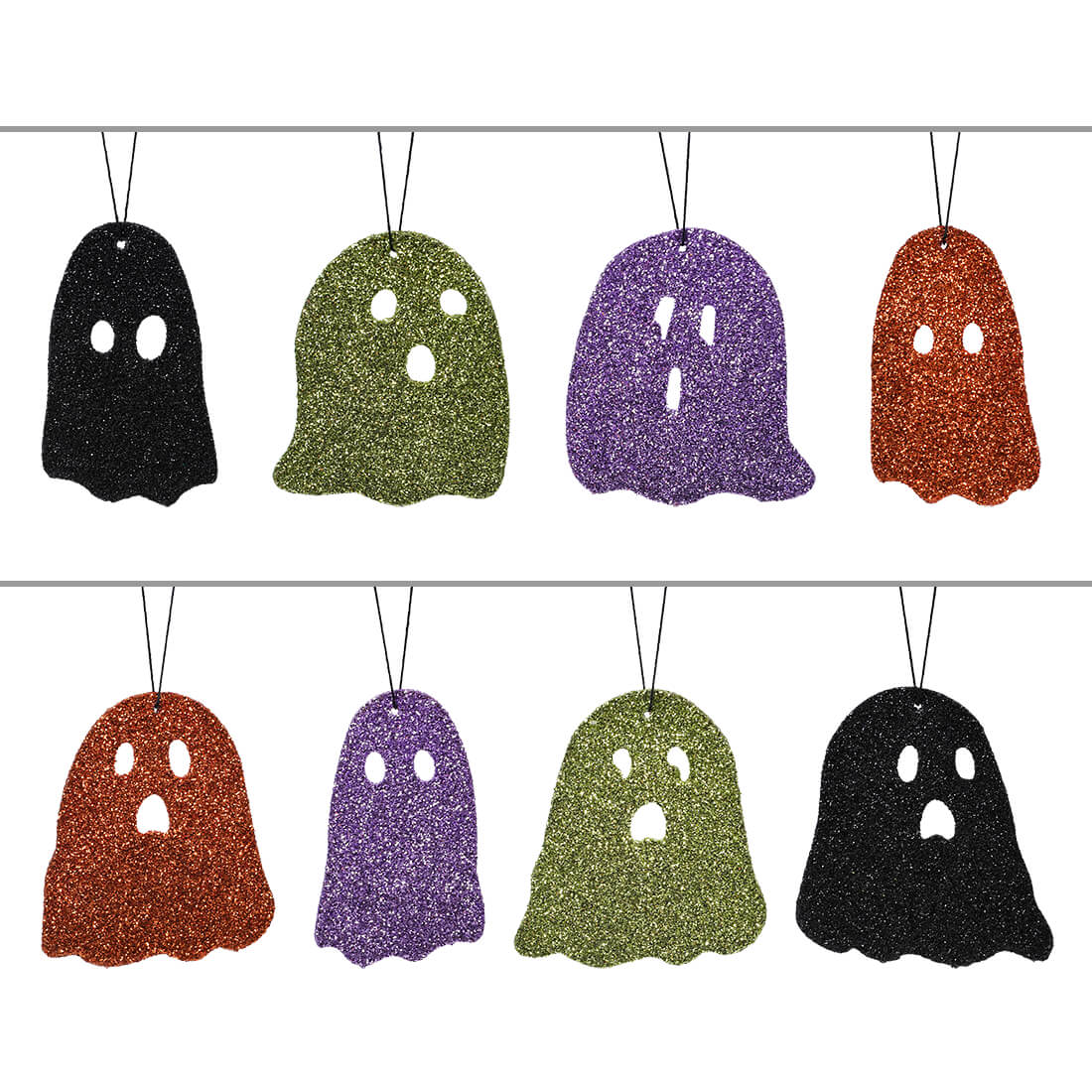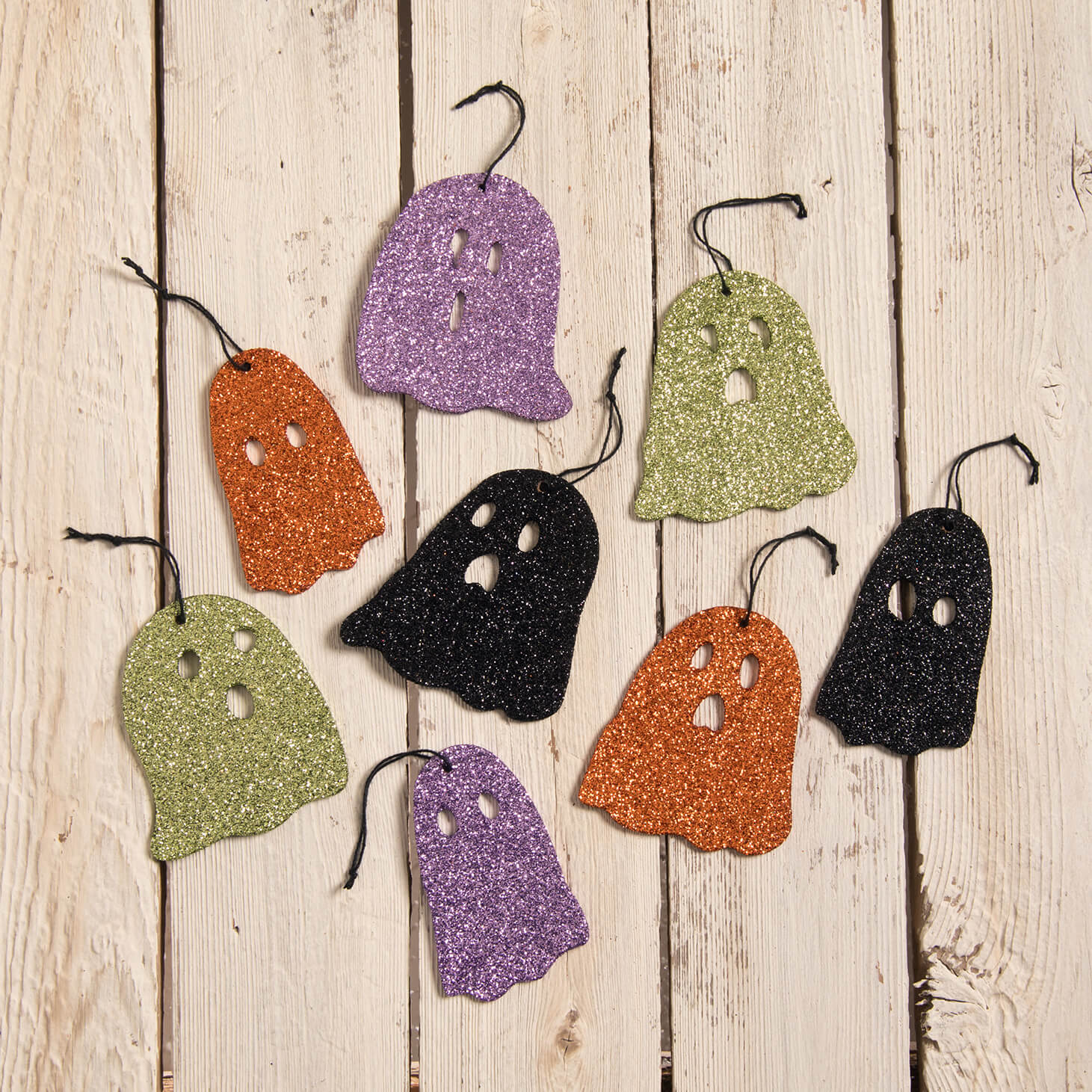 Are you Ready to spruce up your Halloween feather tree this year with something extra special? Then you definitely need a set of Ghostie Boos Ornaments! This fun and festive ornament set includes eight different, glittering ghouls embellished with black, green, purple and orange glitter on both sides!! Add these adorable decorations to your tree to create an eye-catching display that is sure to draw admiring glances from any who happen upon it. Whether it's for yourself or for that special someone in need of a little sparkle this holiday season, these charming ghosts could also be package tie-ons and tied around a napkin at your Halloween soiree! Bring some boo-tiful excitement into your home this season with Ghostie Boo’s Ornaments Set!