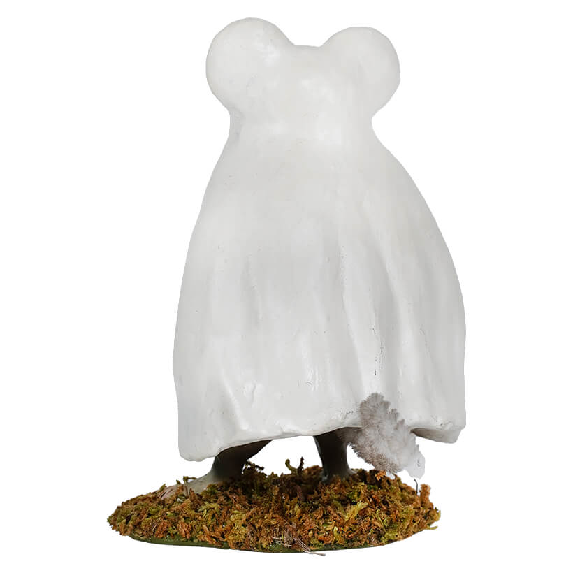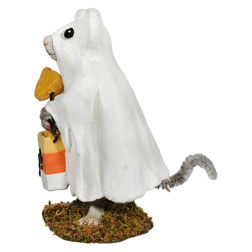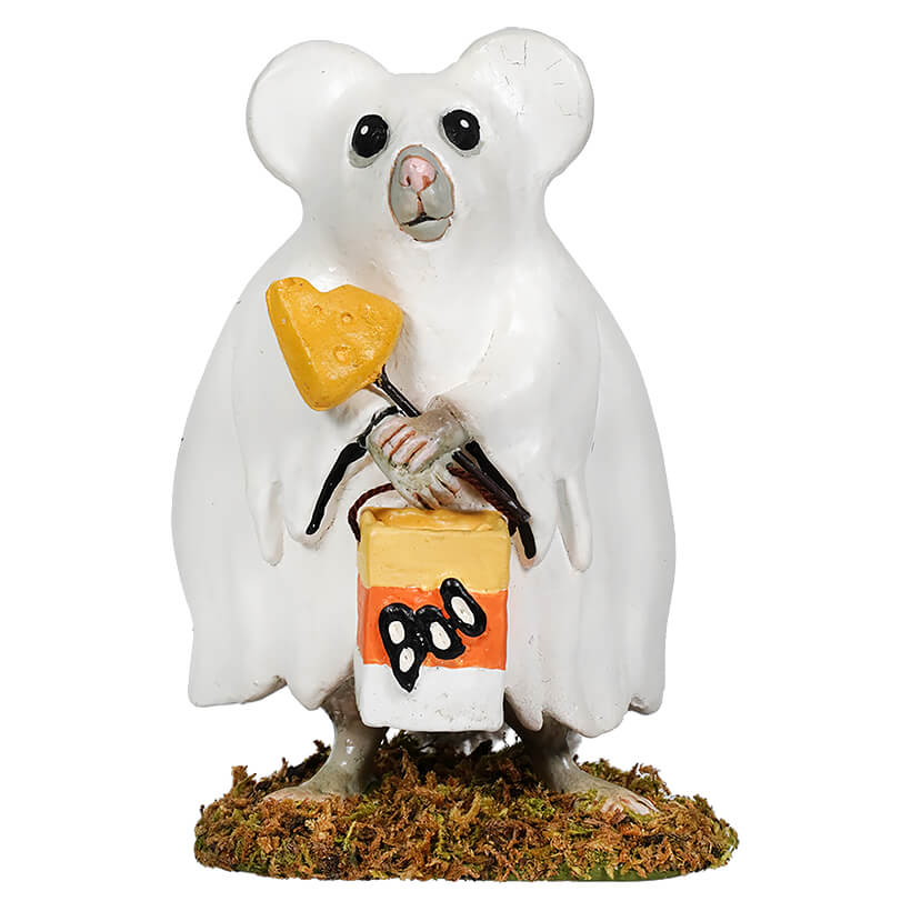 You know how all kids like to dress their pets in costume, especially for Halloween? Just take a look at this little mouse, it looks like some child trimmed a little sheet to fit over the pet mouse, decking out Ghostie Timmy for Halloween fun. From his candy bag with candy corn stripes and BOO printed on it, to his wand topped with a wedge of cheese on the tip, that Timmy took a nibble from, this little guy is so cute and packed with personality! At just over 4 inches tall, this darling figure fits comfortably anywhere in the home, or even on your work desk as an extra special reminder of the upcoming festivities! Make Halloween a little bit sweeter this year with Ghostie Timmy!