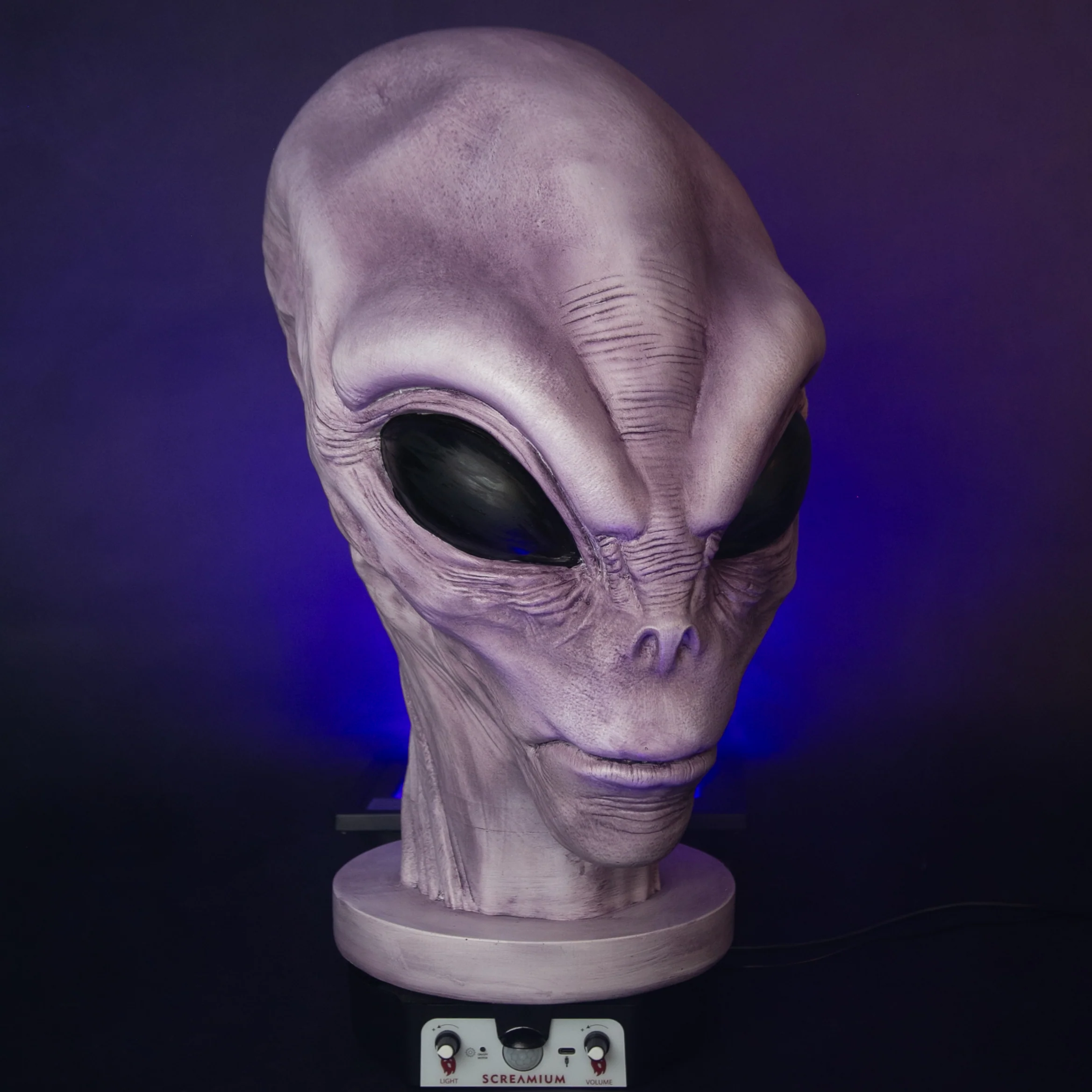 The ultimate Halloween decoration for your home or business, this Giant Alien Monster Animatronic Head prop from halloween features scary alien details inspired by stories of alien abductions from Area 51. An internal light illuminates the undead head with a brightness control to create the perfect visual effect for any situation and a motion sensor on the base of the head triggers a sinister audio sequence. Hand-formed from translucent polyresin material in a roto mold and hand-painted by highly skilled airbrush artisans, each menacing alien head is a work of art that can ultimately only be fully experienced in person... a collectible monster masterpiece!