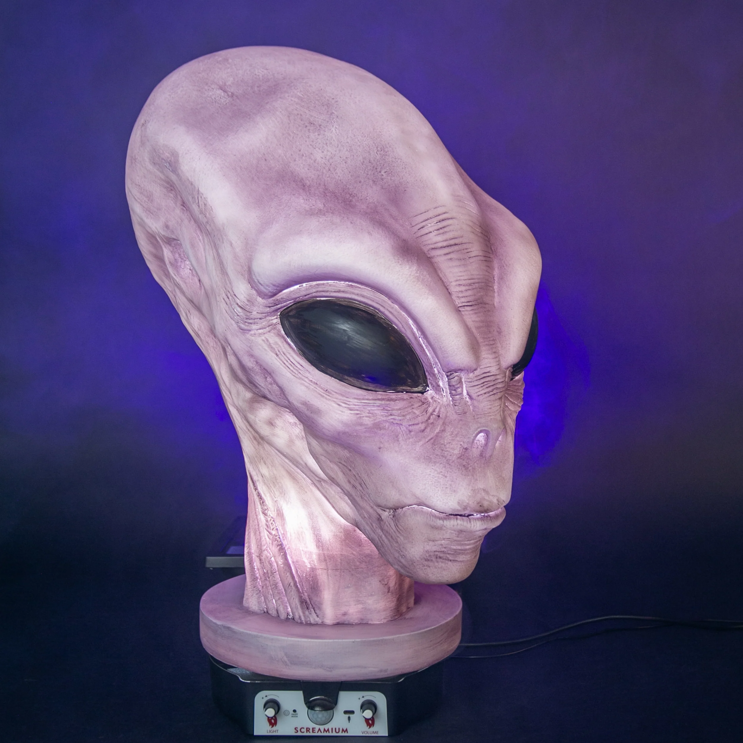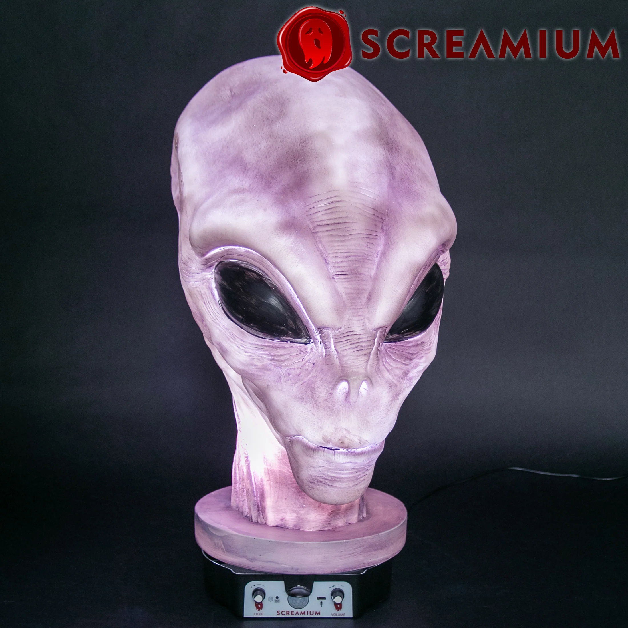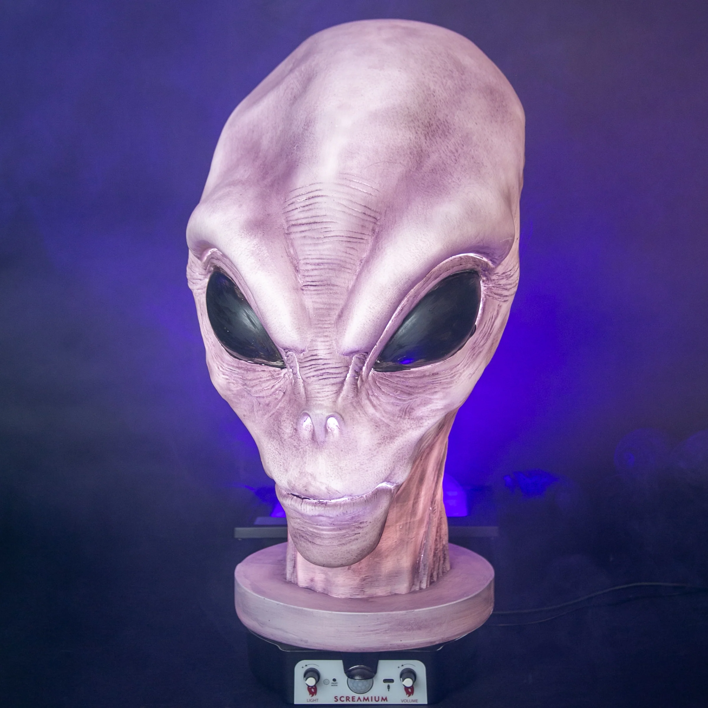 The ultimate Halloween decoration for your home or business, this Giant Alien Monster Animatronic Head prop from halloween features scary alien details inspired by stories of alien abductions from Area 51. An internal light illuminates the undead head with a brightness control to create the perfect visual effect for any situation and a motion sensor on the base of the head triggers a sinister audio sequence. Hand-formed from translucent polyresin material in a roto mold and hand-painted by highly skilled airbrush artisans, each menacing alien head is a work of art that can ultimately only be fully experienced in person... a collectible monster masterpiece!