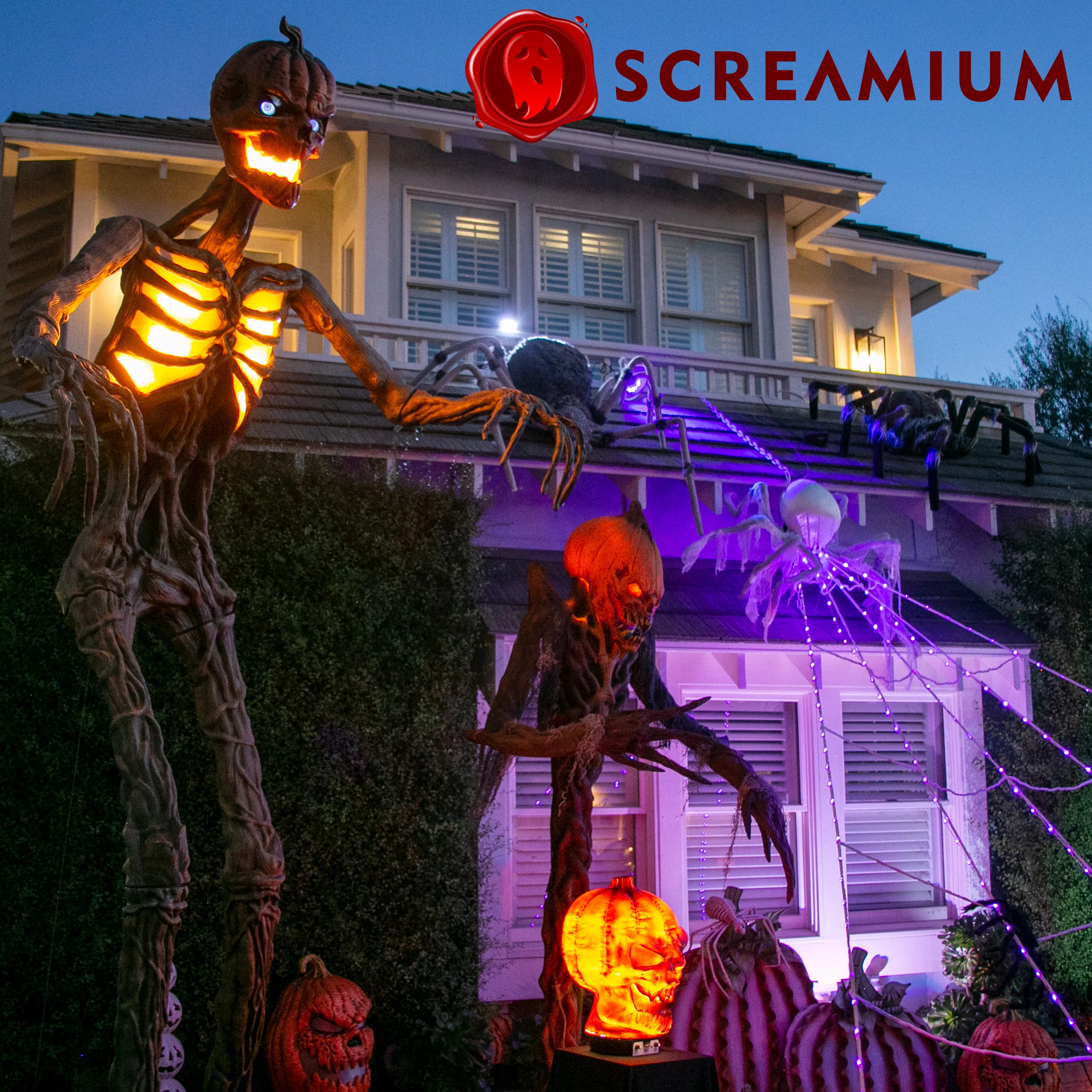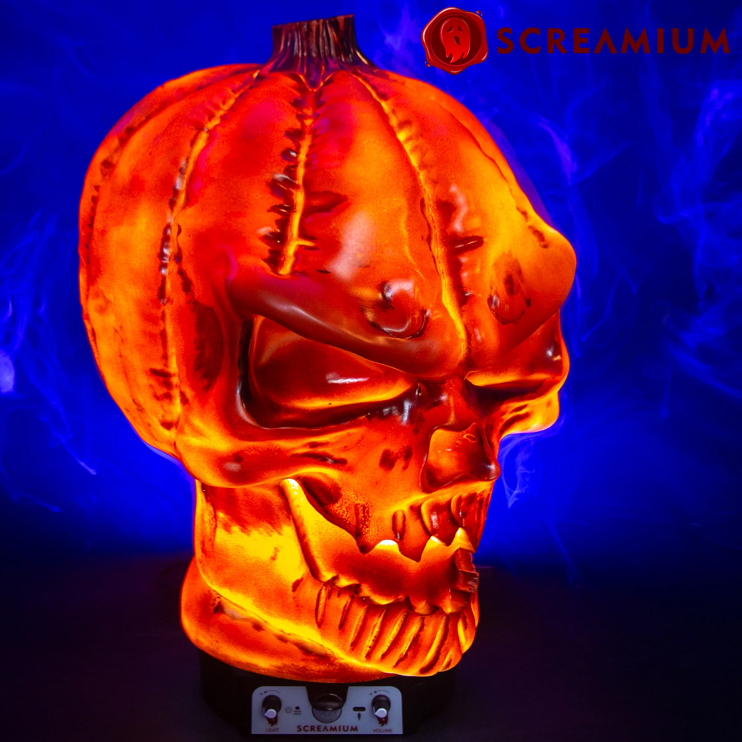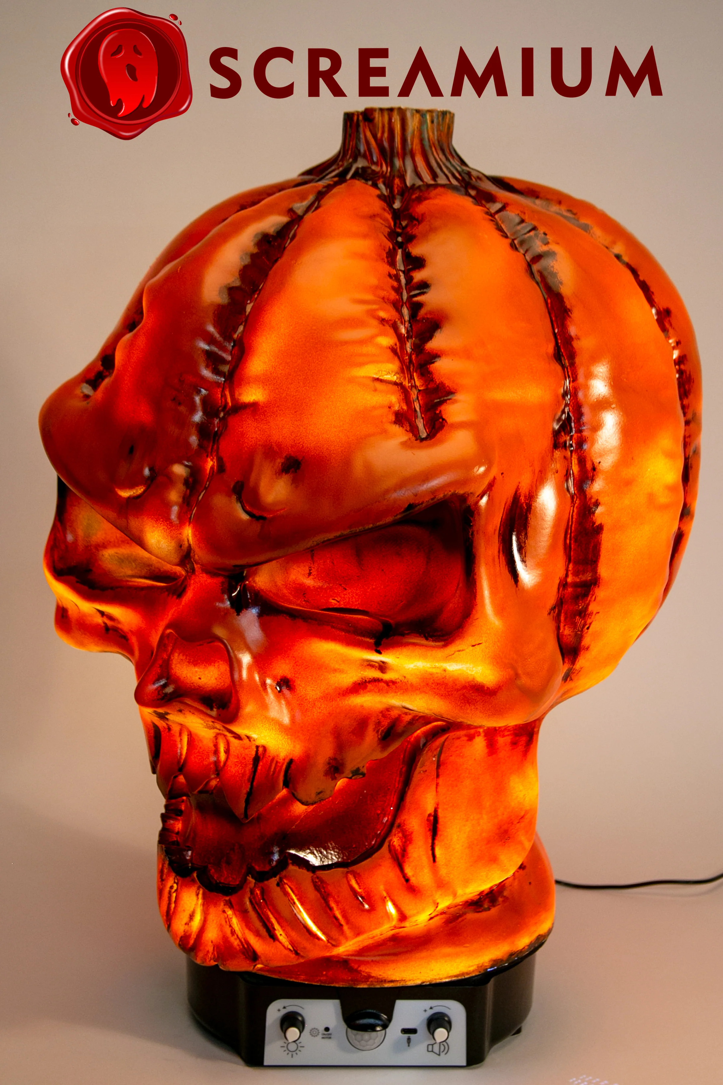 The ultimate Halloween decoration for your home or business, this Giant Pumpkin Monster Animatronic Head prop from halloween features scary details such as sunken eye sockets and big, gnarly teeth. An internal light illuminates the undead head in dark environments with a brightness control to create the perfect effect. The audio sequence is triggered by a motion sensor on the base of the head. You'll experience the amazing artistry of this monster masterpiece when viewed in person. Hand-formed from translucent polyresin material in a roto mold and hand-painted by highly skilled airbrush artisans, each pumpkin head is a work of art unto itself!
