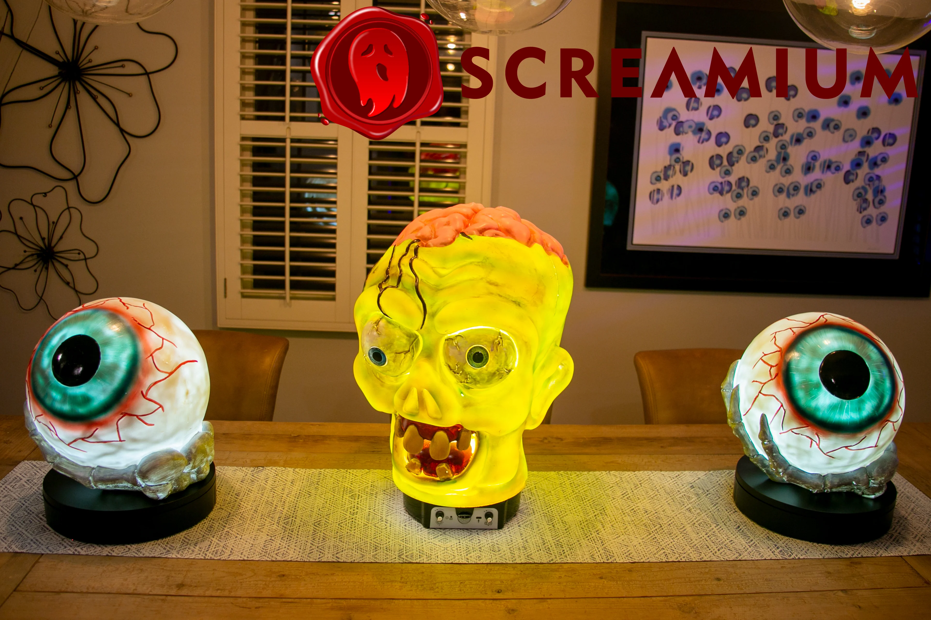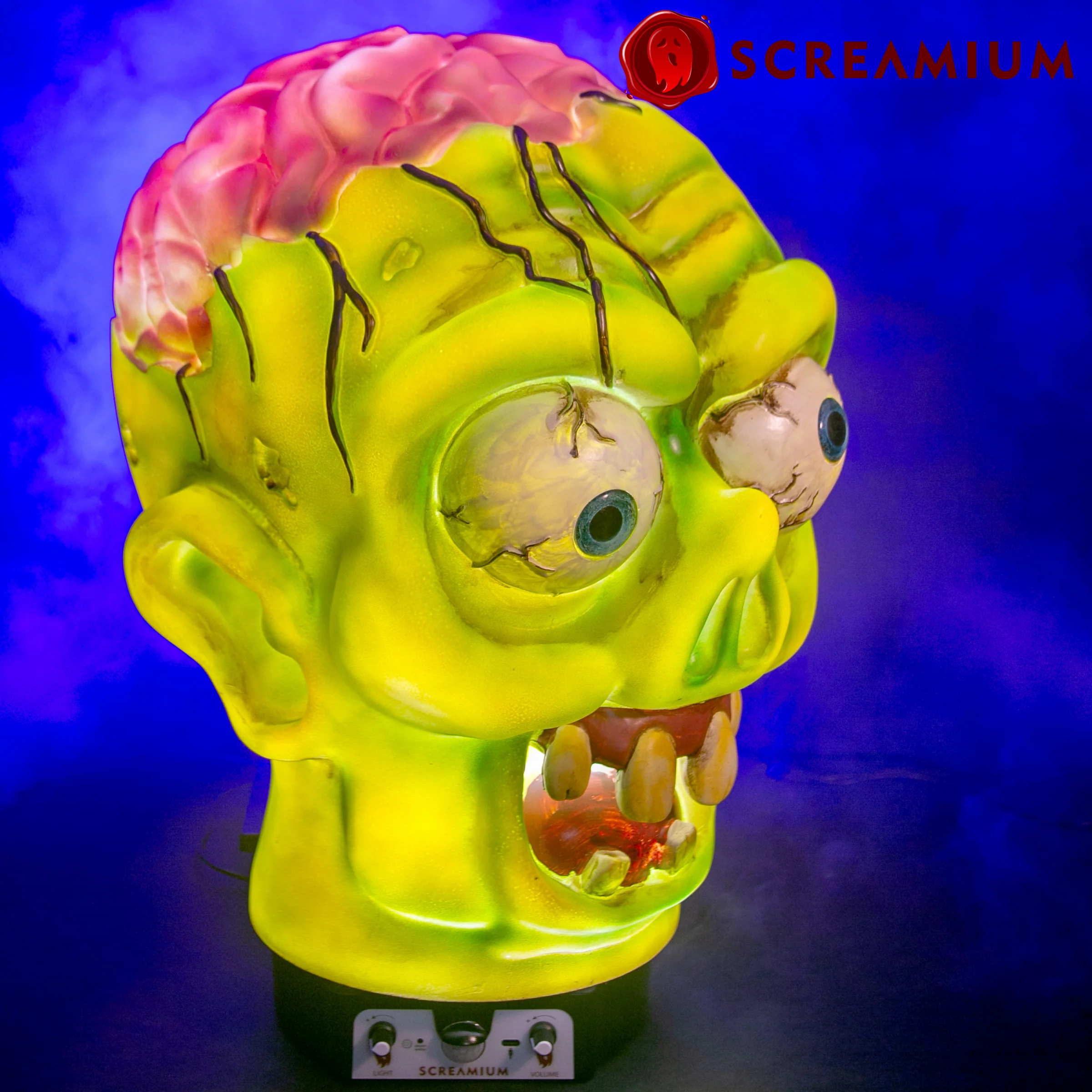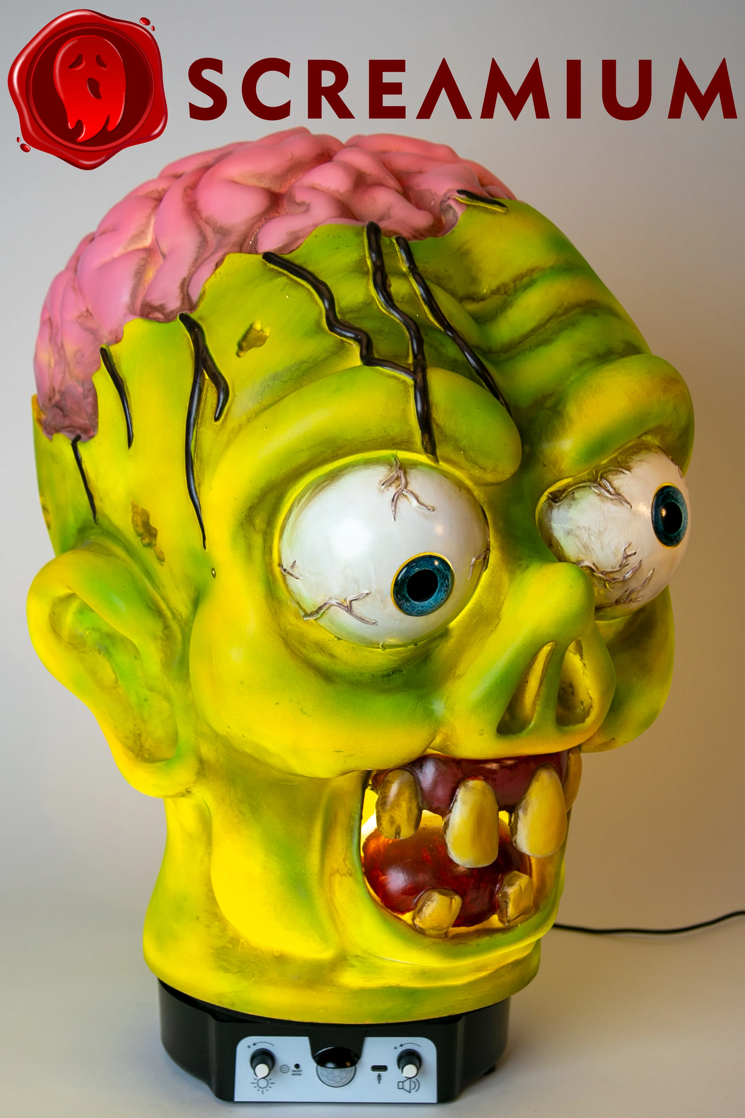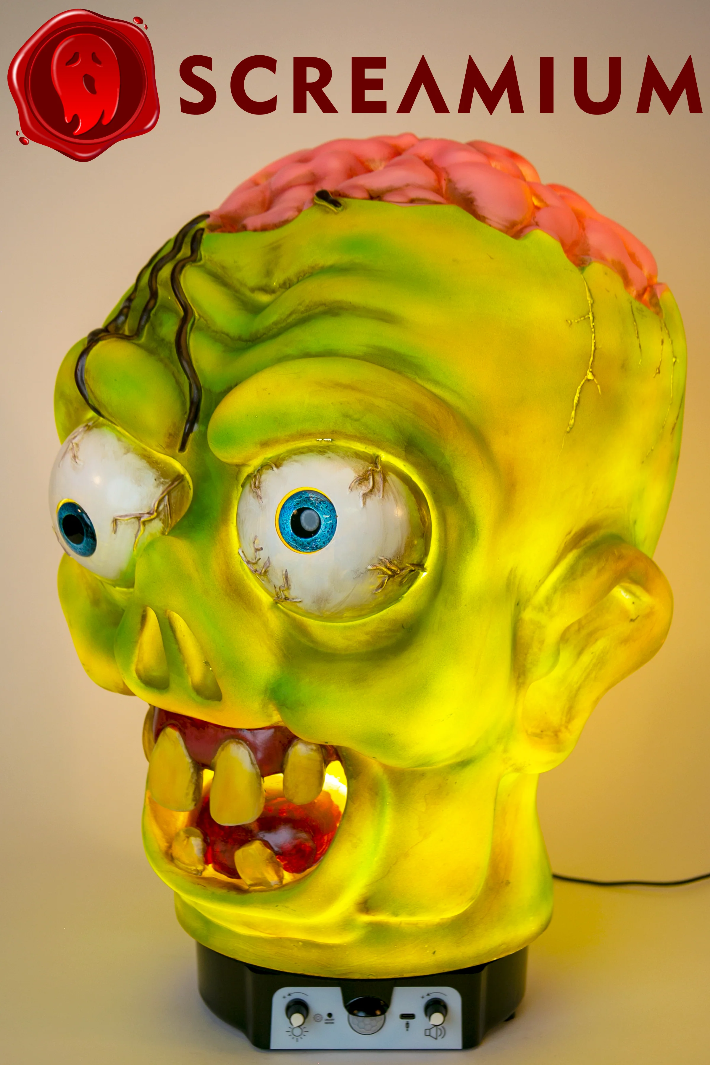 The ultimate Halloween decoration for your home or business, this Giant Zombie Head prop from halloween features scary details such as bulging eyeballs, exposed brains, and the audio sound of the soulless creature groaning for "BRAINS!" as he rotates. An adjustable internal light illuminates the undead head in dark environments. A motion sensor triggers the sound effects. When viewed in person, you'll experience the amazing artistry of this monster masterpiece. Formed from translucent poly-resin material in a roto mold and hand-painted by highly skilled airbrush artisans, each zombie is a work of art unto itself!