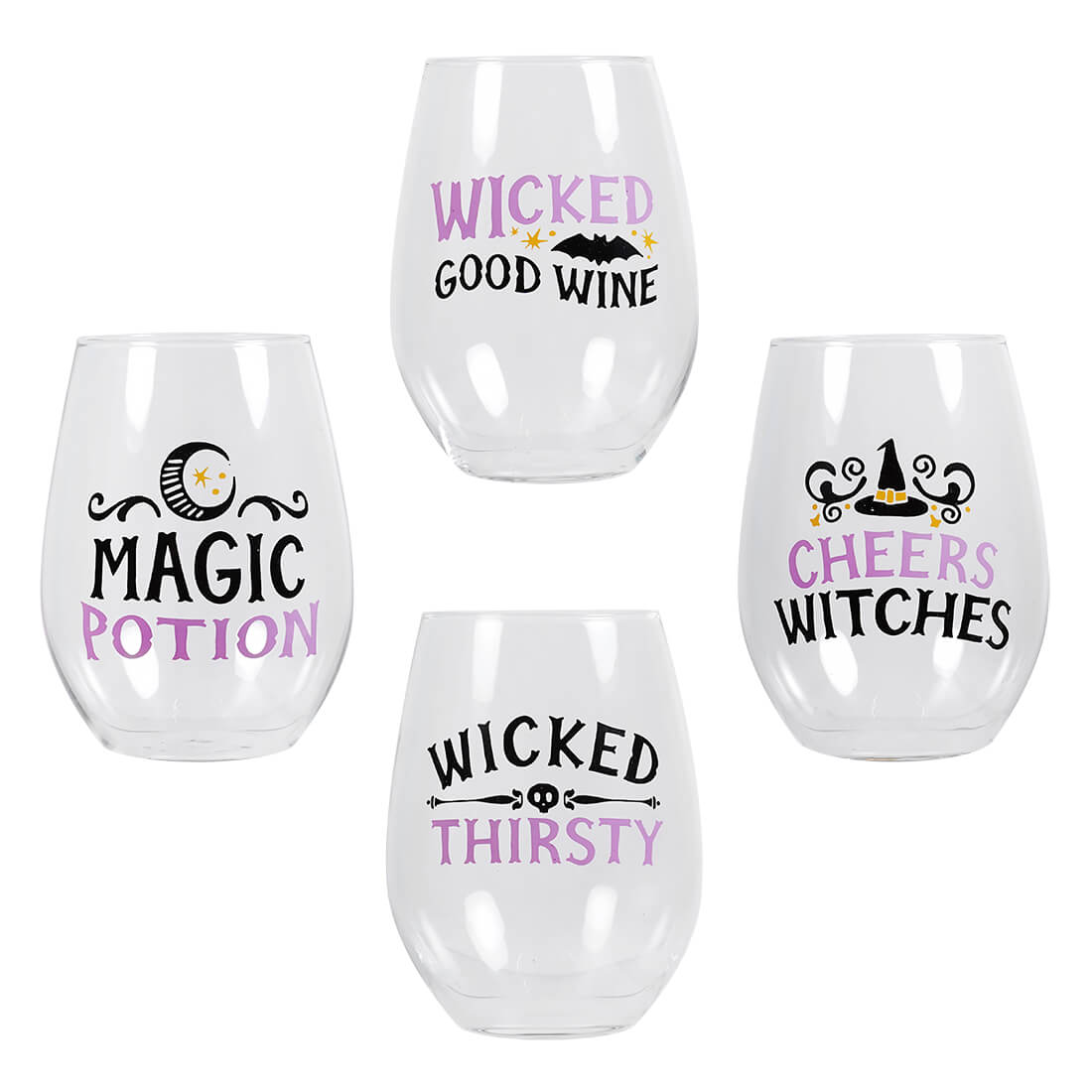 Celebrate Halloween with enthusiasm by using these holiday glasses, which are truly a treat and not a trick! Each glass comes with different words and a distinct design on the front to mark the magical time of All Hallows Eve. The 18oz Witchy Stemless Wine Glasses Set includes four glasses that come in a boxed package for convenient storage or fabulous gift giving. Any Halloween party host would be delighted to receive this set of spooktacular glasses. These glasses are perfect for those who want to celebrate their favorite holiday and enjoy the fun sayings on each glass while toasting. They read "Wicked Good Wine", "Magic Potion", "Cheers Witches" and "Wicked Thirsty." This set of glasses has such a playful design and would make a great present for someone with an October birthday or really for anyone looking for unique glasses for their Halloween dinner.
