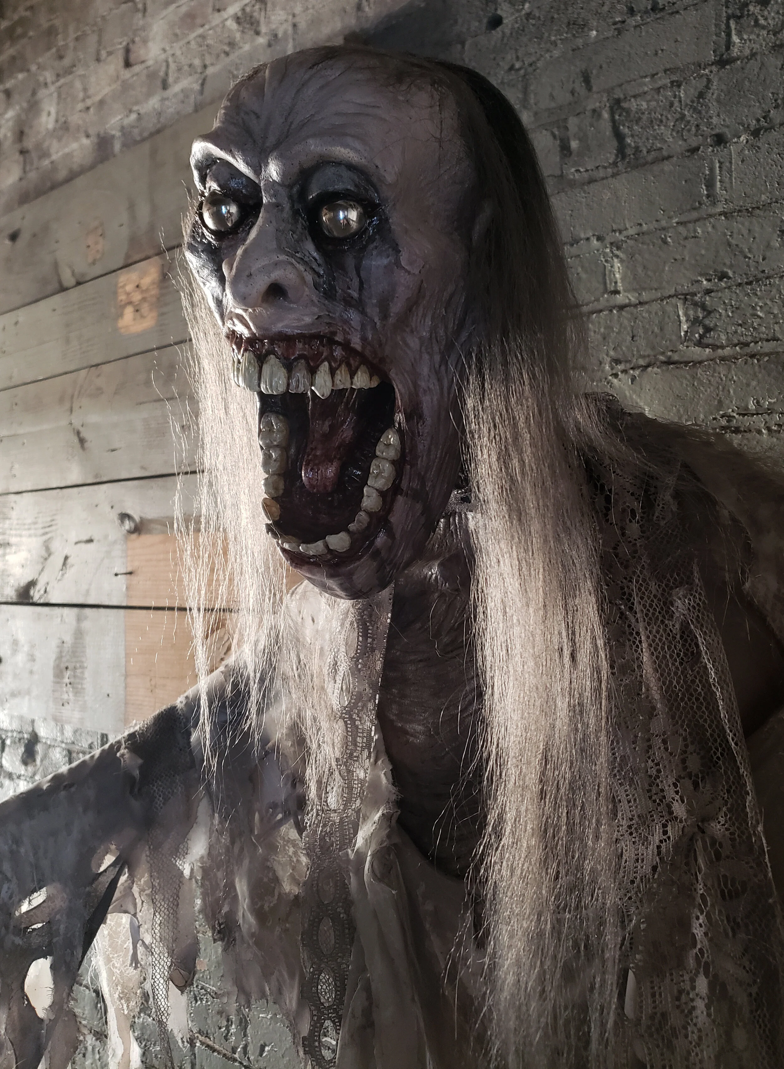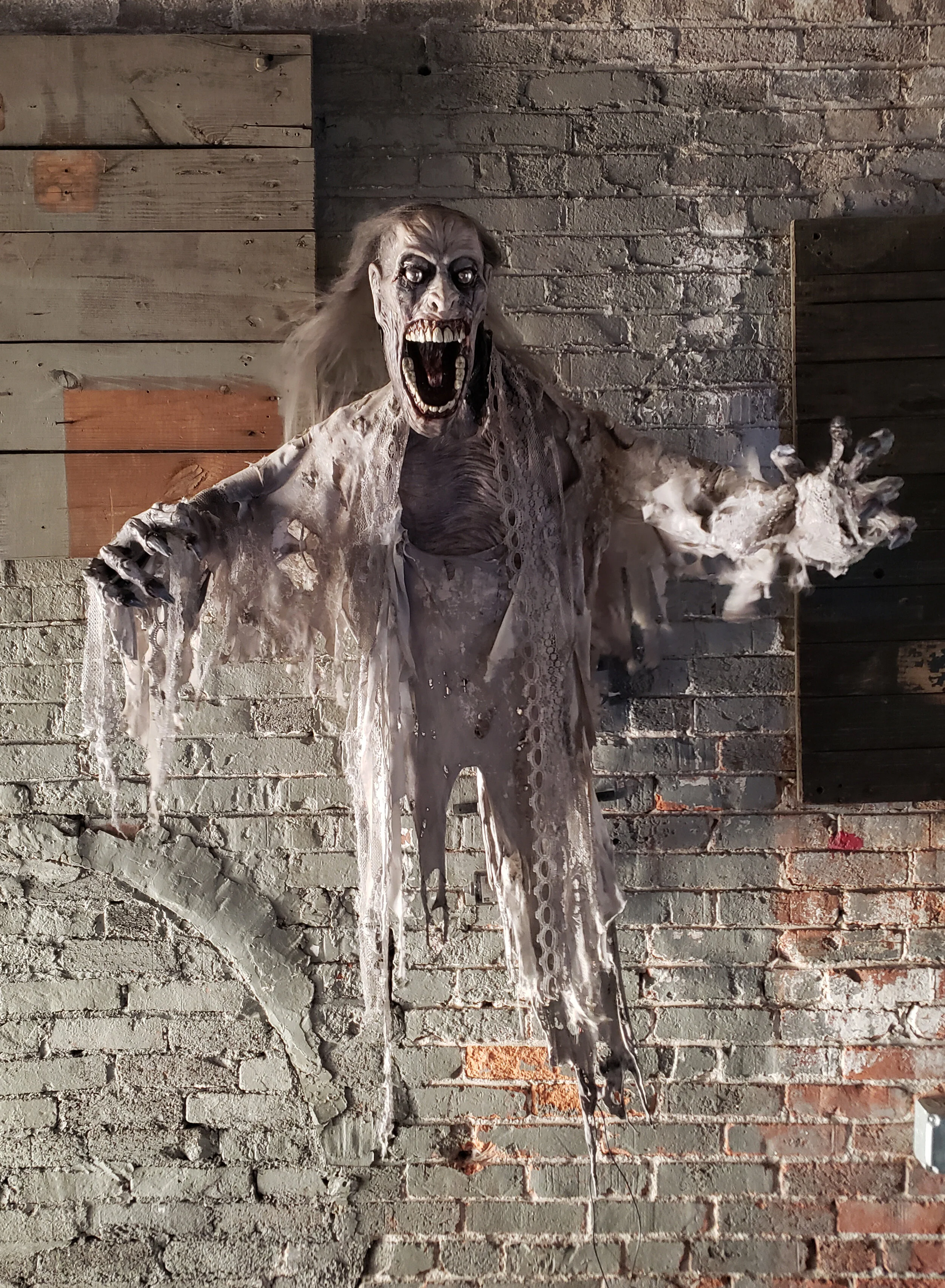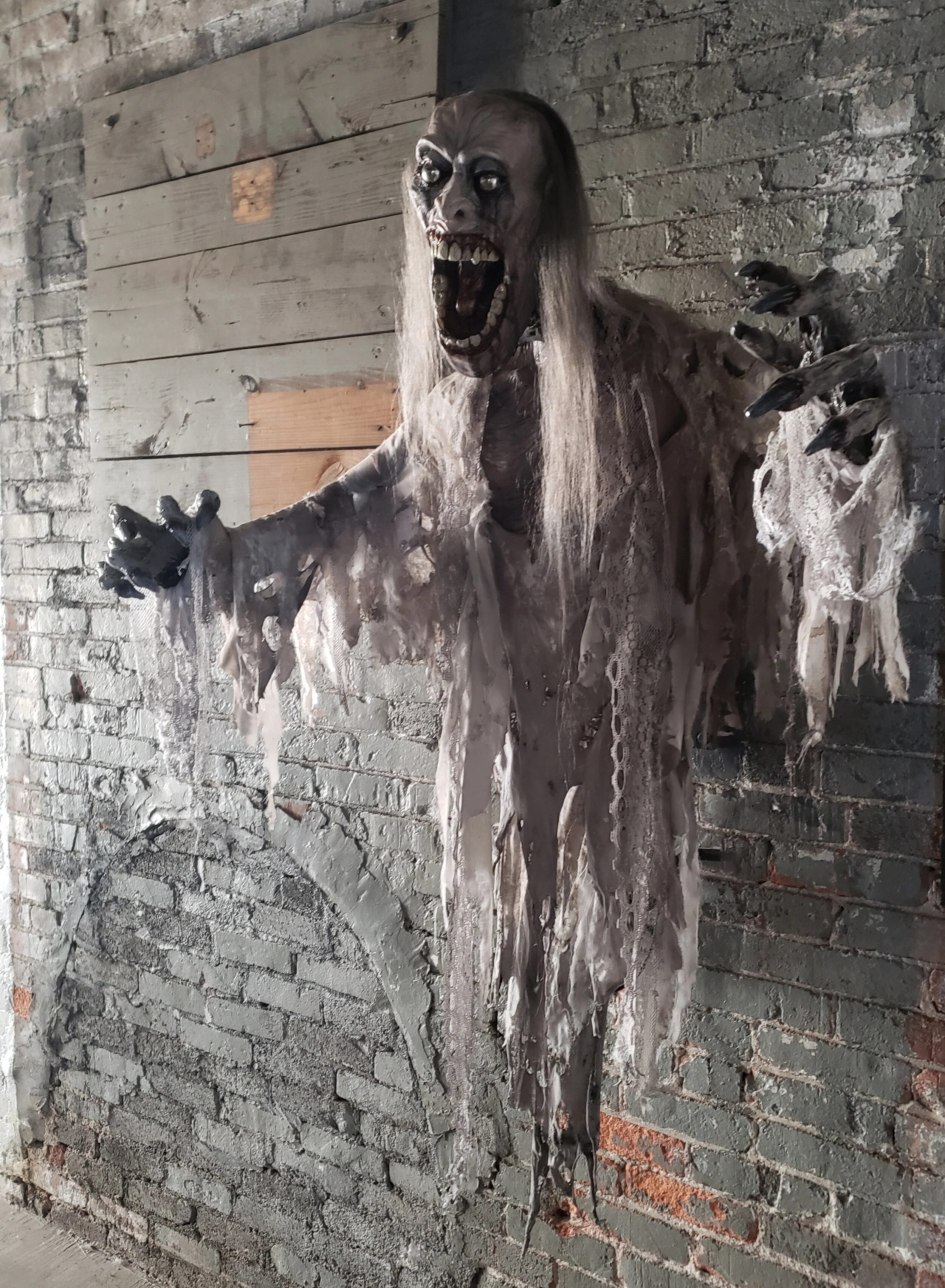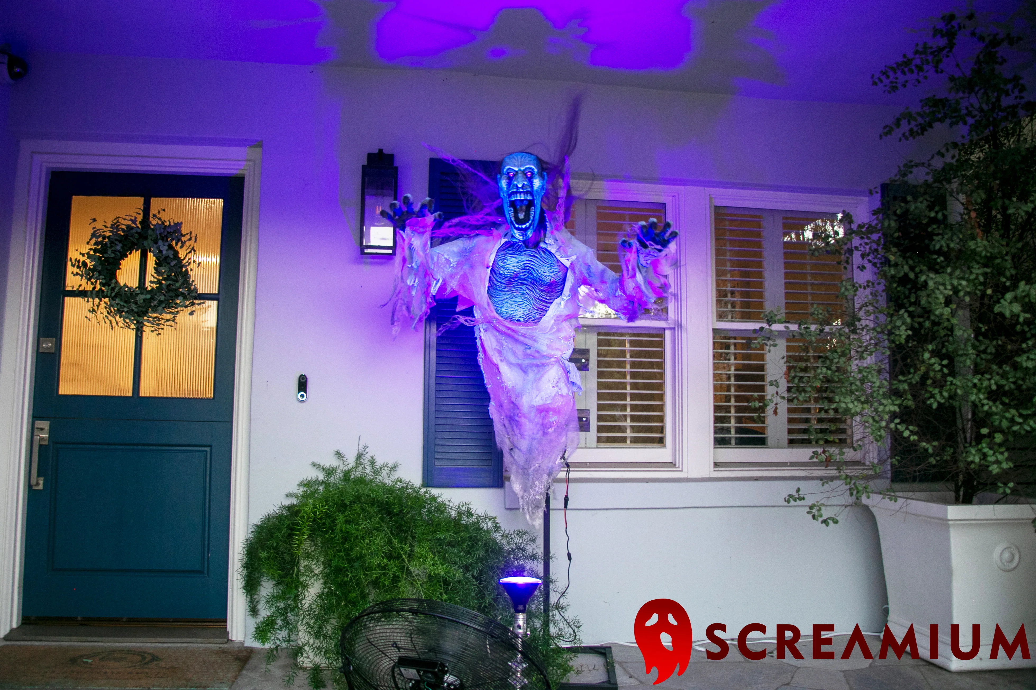 Take your Halloween decorating to the next level with this unique animatronic prop monster normally found only at professional haunted houses! With his gangling arms, enormous mouth, and stringy hair, this ectoplasmic entity reaches out to you with a menacing pose as its body moves up and down in a serpentine animatronic motion. The zombie ghost is lightweight and can be hung easily to studs on any wall or use the included metal stand to position him as a stand-alone monster for the ultimate Halloween decoration. Simply add a fan under this creature to bring its hair and tattered body to life. This character features UV paint for installations that have black lights for an extra supernatural effect. Measures approximately 64 inches from its head to the bottom of its shredded dressing, and 40 inches from hand to hand. Includes a 48-inch tall stand made of metal and wood. Requires screwing the monster body to the stand with 4 screws using a hex-head drill bit.
