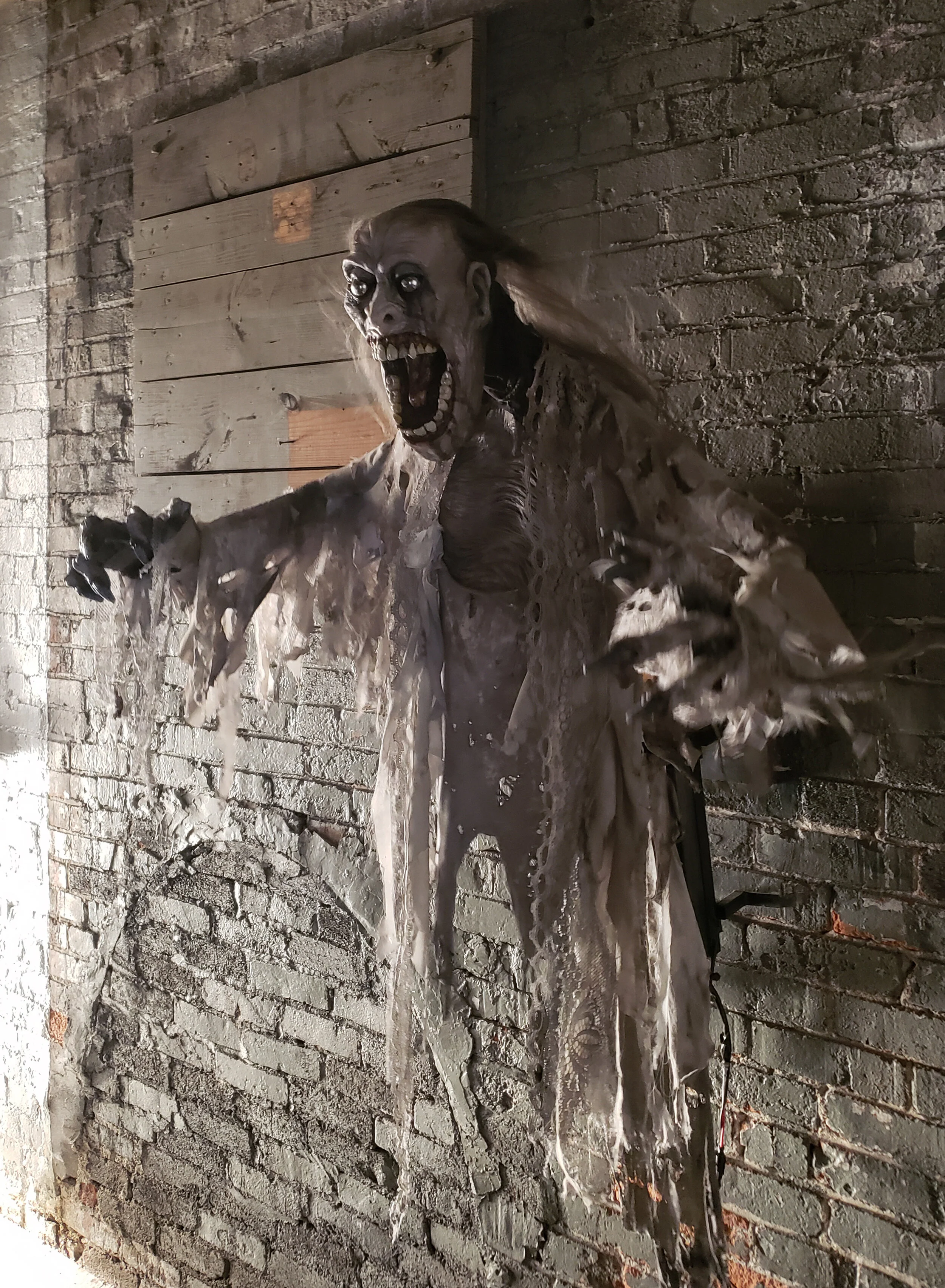 Take your Halloween decorating to the next level with this unique animatronic prop monster normally found only at professional haunted houses! With his gangling arms, enormous mouth, and stringy hair, this ectoplasmic�entity reaches out to you with a menacing pose as its body moves up and down in a serpentine animatronic motion. The zombie ghost is lightweight and can be hung easily to studs on any wall or use the included metal stand to position him as a stand-alone monster for the ultimate Halloween decoration. Simply add a fan under this creature�to bring its hair and�tattered�body to life. This character�features UV paint for installations that have black lights for an extra supernatural effect. Measures approximately 64 inches from its head to the bottom of its shredded dressing, and 40 inches from hand to hand. Includes a 48-inch tall stand made of metal and wood. Requires screwing the monster body to the stand with 4 screws using a hex-head drill bit.