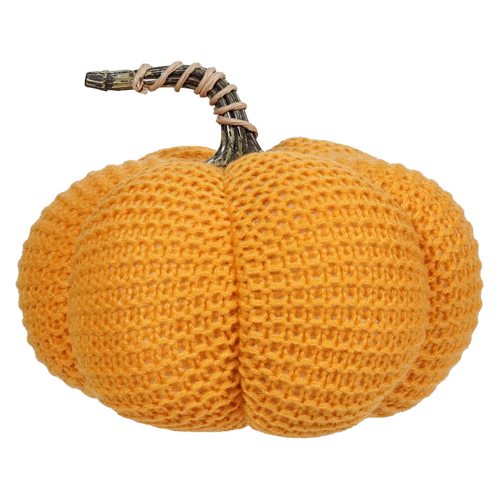 We love to add resin pumpkins to our fall decoration collection, because it makes decorating so much easier! Just gather them all together in a wheelbarrow or barrel stuffed with fall greenery and leaves and voila! You have the beginnings of a display...no carving, no mess, no muss!~ So, get ready to spice up your Fall decor with our one-of-a-kind Golden Yellow Knit Stuffed Pumpkin! This knitted look cutie, will be sure to draw all the right kind of attention in any pumpkin grouping or display. With its bright and vibrant yellow color, it's sure to bring life to your Autumn decorations. Whether as a cute accent piece or a gift for a special person in your life, this plump pumpkin is the perfect solution for all of your Fall needs!