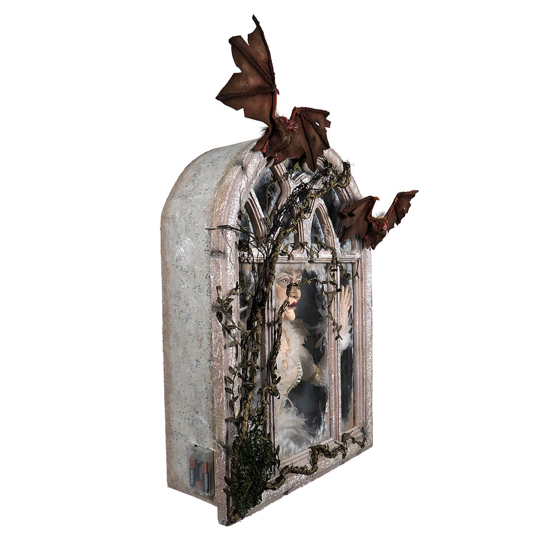As the temperatures cool and days shorten, it's time to bring out the spooky decorations for Halloween. This Gone Batty Window with Ghost Scene will be a perfect addition to any haunted house! With intricate detailing that brings this ghostly scene to life, the window looks as though it came straight from some abandoned mansion. Turn the switch on so the scene comes to an eerie glow, casting shadows on the ghost of an old woman who peers through the window, while creeping vines reach up from below and a pair of bats flutter from above. Whether it's on its own or part of a larger display, this unique window prop will be sure to make any house look haunted! For those looking to make this year the spookiest yet, Gone Batty with Ghost Scene by Katherine's Collection is the perfect touch of otherworldly fright!