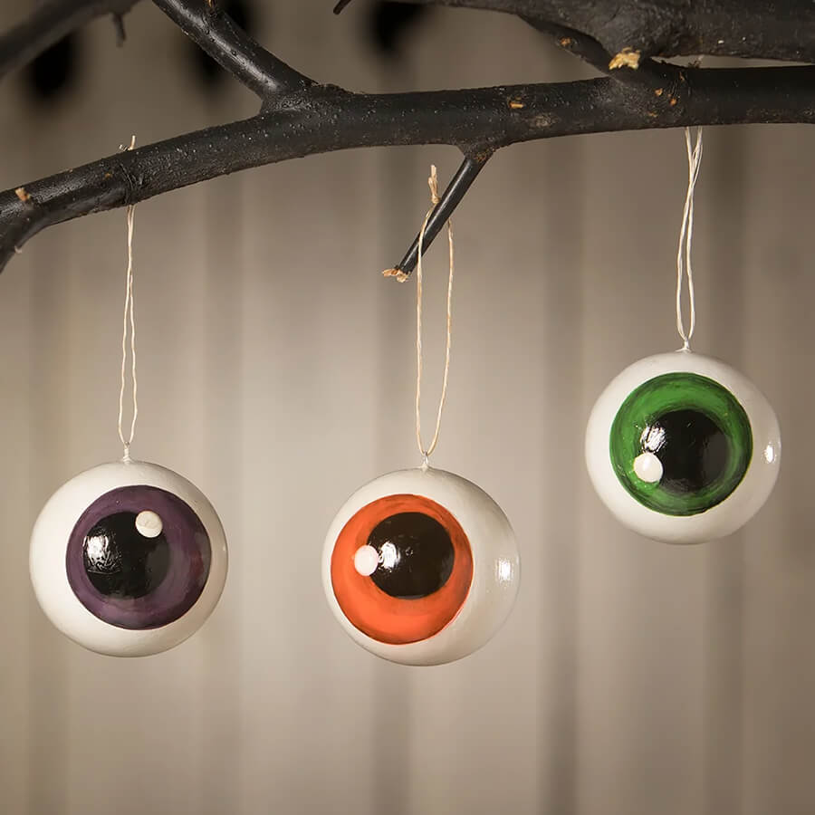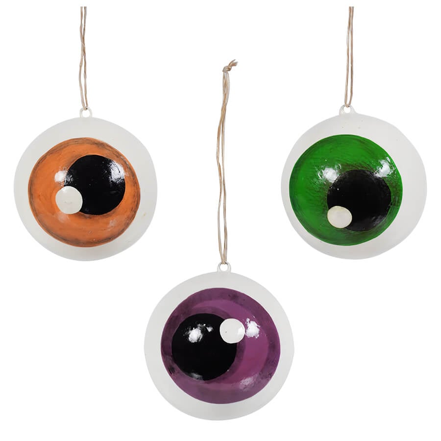 We know you love to bring the chills and thrills of Halloween to your decor, so why not do it with something that will really make heads turn (or roll)? The set of 3 Googly Orange, Purple & Green Eyeball Ornaments brings a uniquely creepy decoration that your visitors won’t be able to look away from. Place these three eye-catching ornaments in a bowl of shredded black tinsel on a side table or at unexpected places on your food table, for a sure fire way to bring the extra spook-factor to your haunted home this Halloween. But you could always go the traditional route and hang them on a Halloween tree, but why not tuck them in with a grouping of Halloween figures on a bookshelf where guests may least expect it. With these eyeball orbs, you can create the perfect atmosphere for a spooky Halloween night!