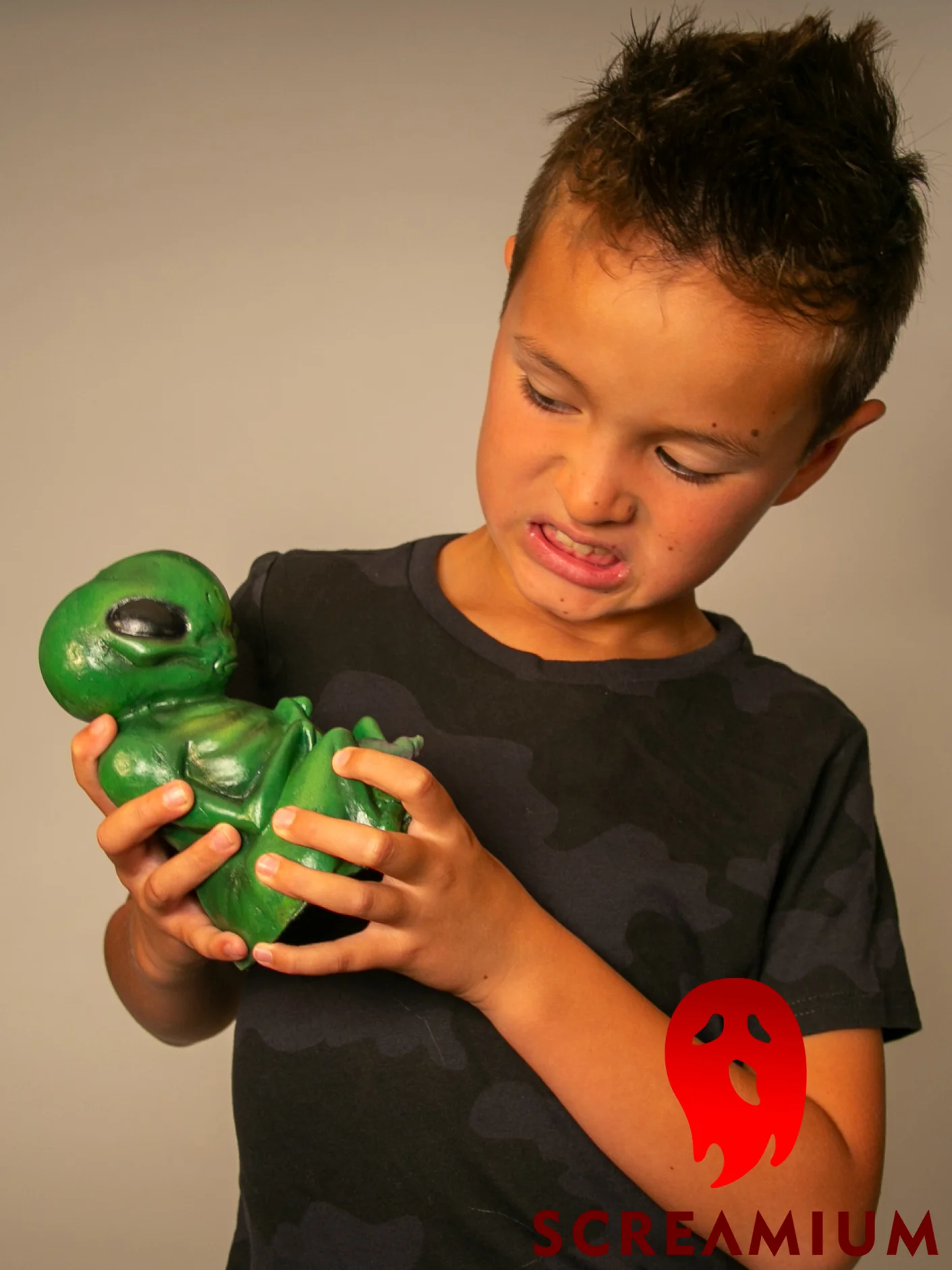Discovered in a secret lab in Area 51, this alien embryo makes the perfect Halloween decoration for your party this season or a prop for a horror movie night. Featuring a green hue, protruding skeletal structure, and severed umbilical cord, the alien monster baby makes a scary display in his jar of formaldehyde (no need to mention to party guests that it is just water... hee hee).