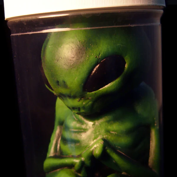 Discovered in a secret lab in Area 51, this alien embryo makes the perfect Halloween decoration for your party this season or a prop for a horror movie night. Featuring a green hue, protruding skeletal structure, and severed umbilical cord, the alien monster baby makes a scary display in his jar of formaldehyde (no need to mention to party guests that it is just water... hee hee).
