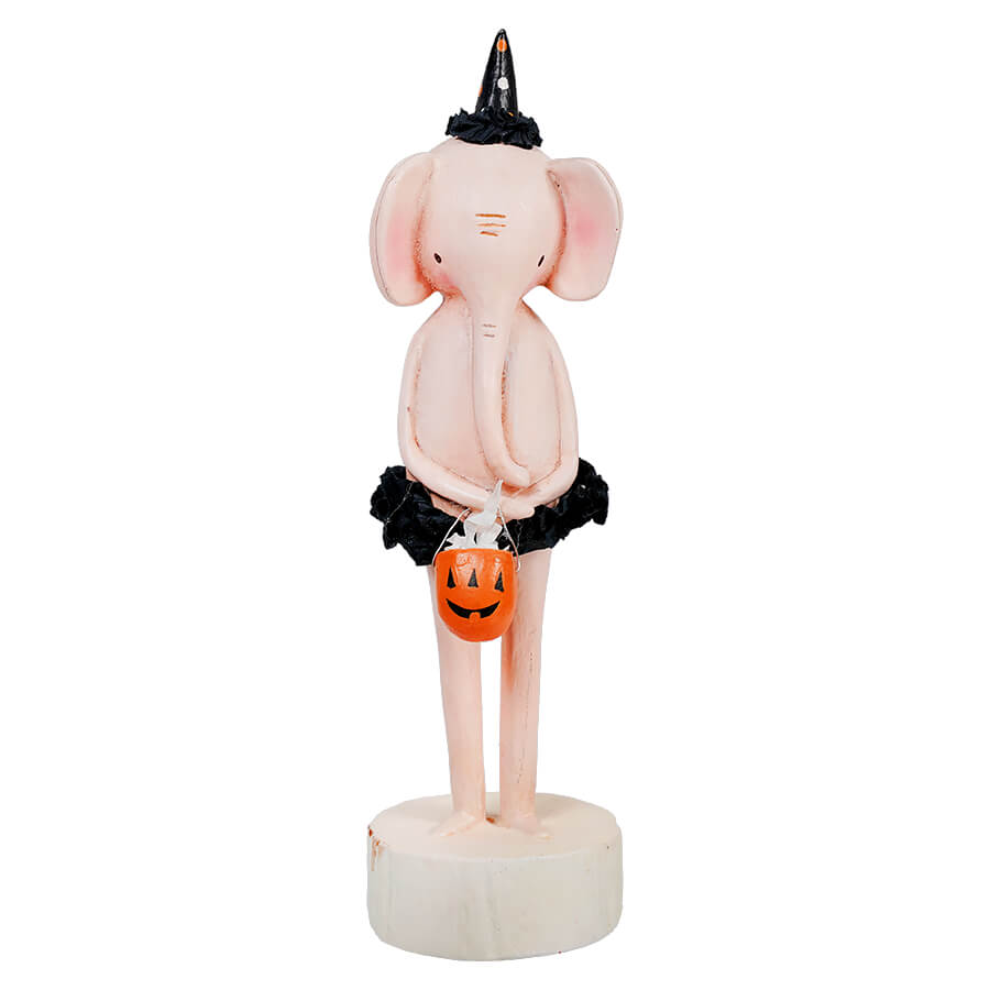 It's Halloween, the perfect opportunity to get creative with new decorations! Meet Halloween Ellie, the most adorable little elephant you'll ever see! This cute creature is made of hand-painted resin and adorned with a black crepe paper tutu and a small witch hat. Furthermore, she has her own little orange pumpkin bucket, so she's all set to go trick-or-treating too! Especially if you let her adorable Halloween animal friends: the Hippo, Rhino, and Zebra tag along! All together, they are sure to bring a smile to any who cross their path! With all these cute Halloween critters together this Halloween season is sure to be a carnival of fun!